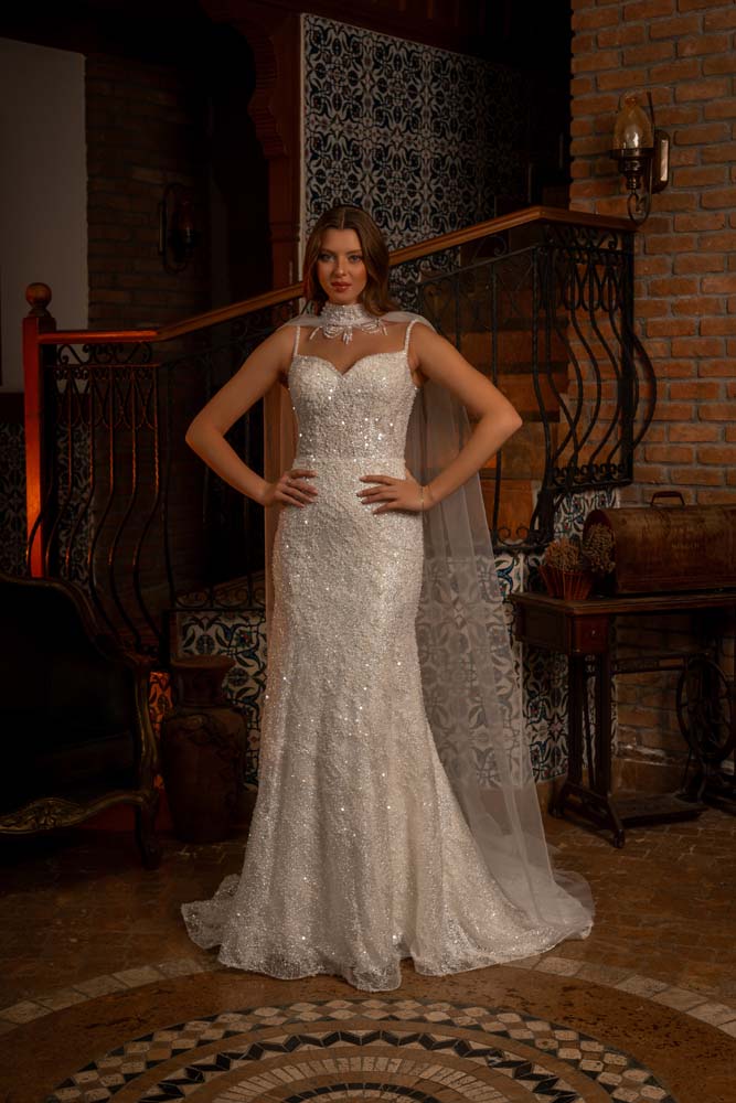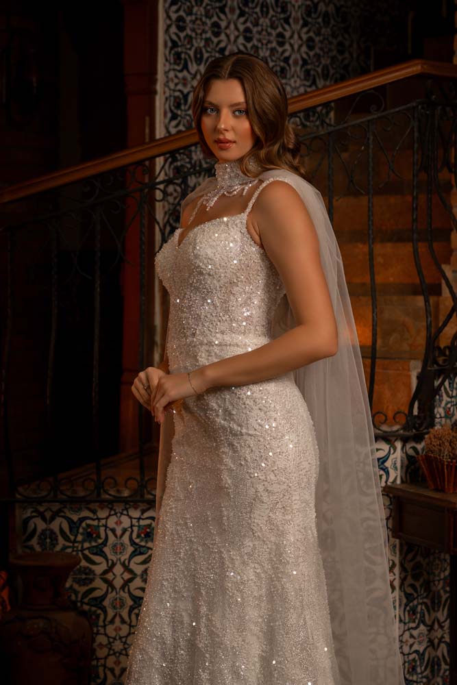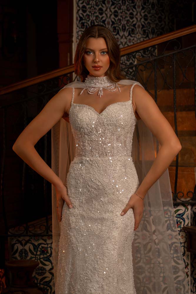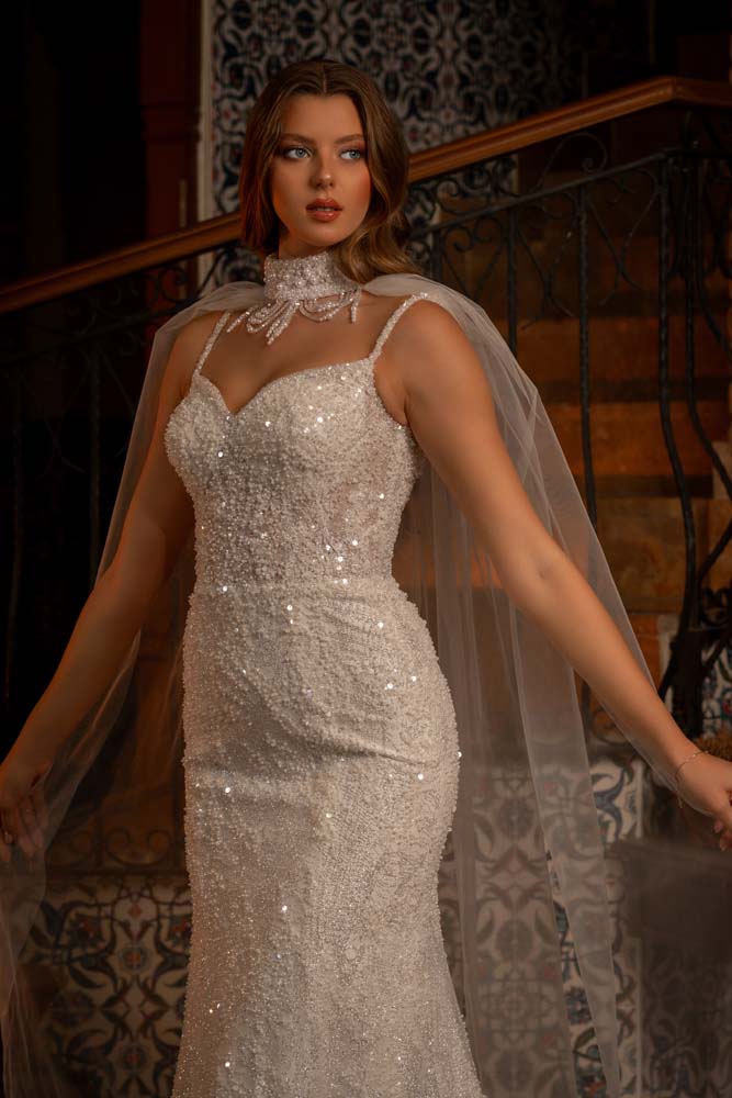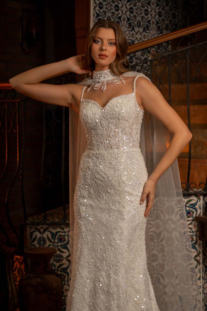 Boyun Şalı Detaylı Kedi Kulağı Yaka İnce askılı Kasnak Dantel Balık Model Gelinlik