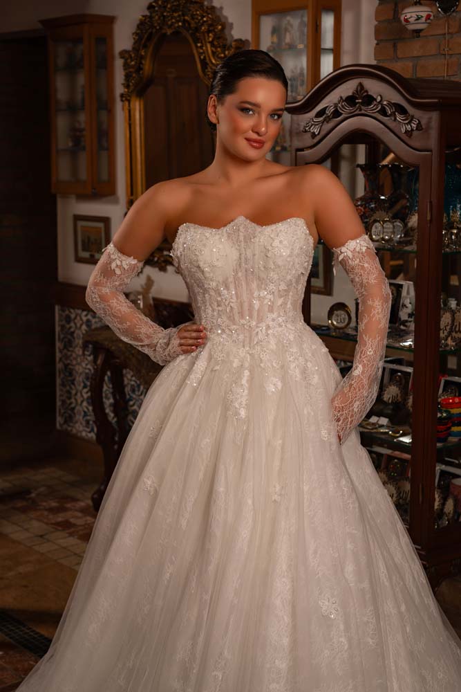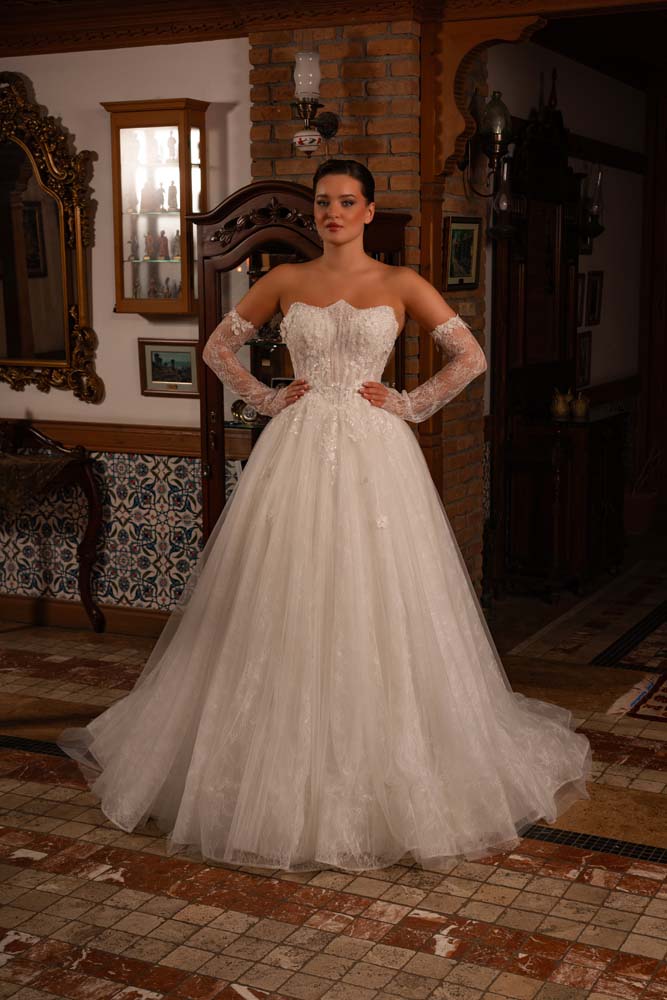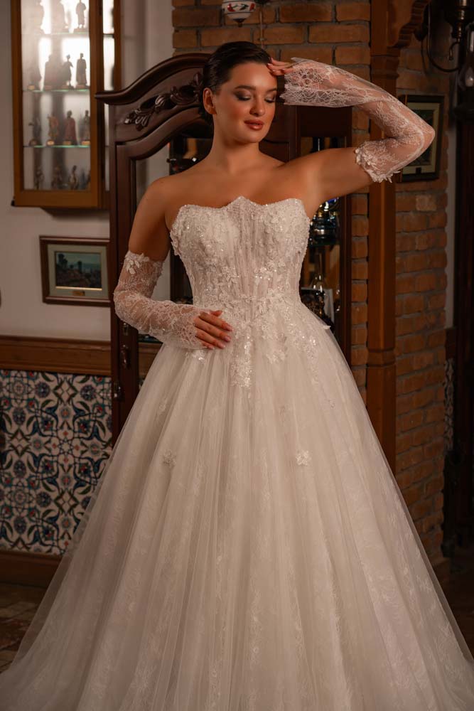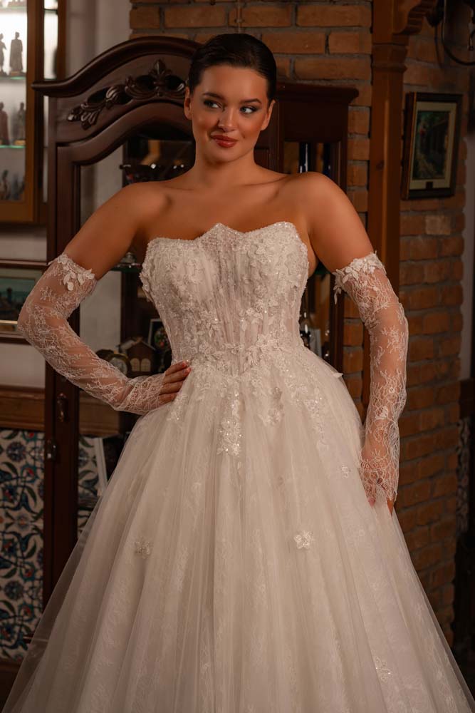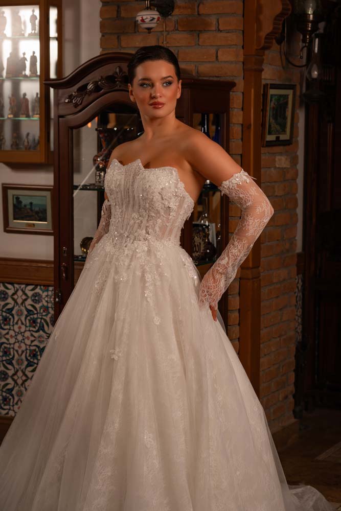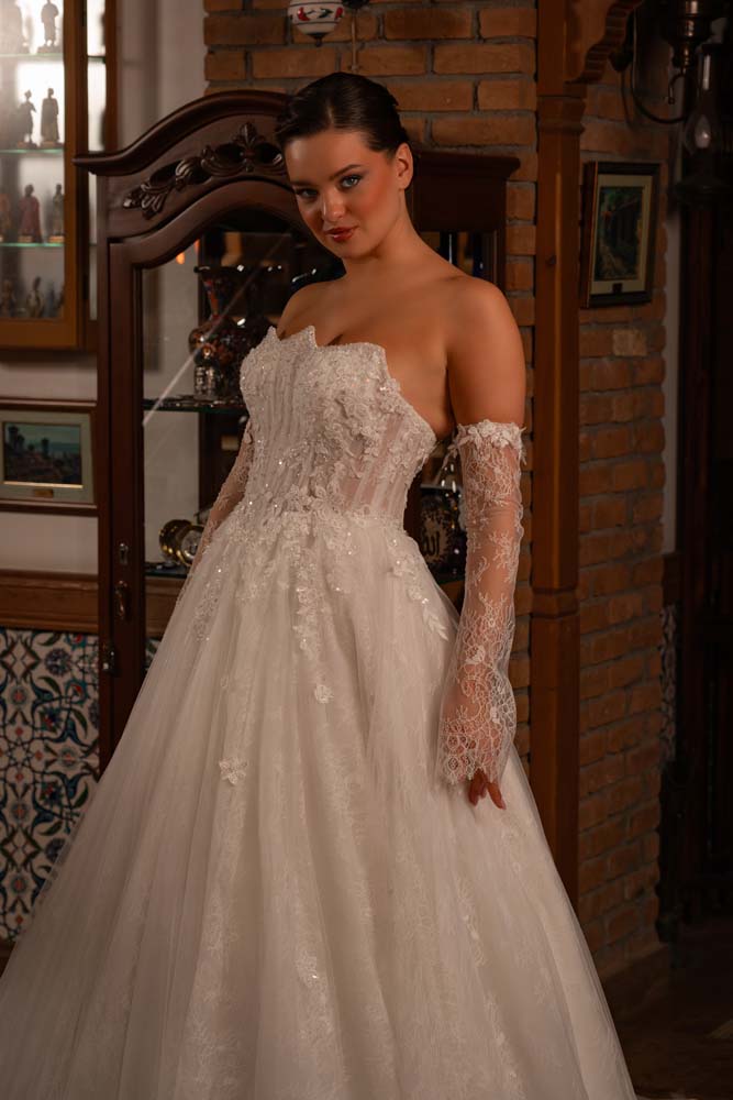 Fransız Yaka Transparan Beden Üç Boyut Detaylı Dantel Yan Kol Helen Gelinlik Modeli
