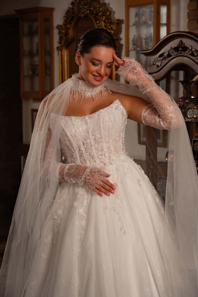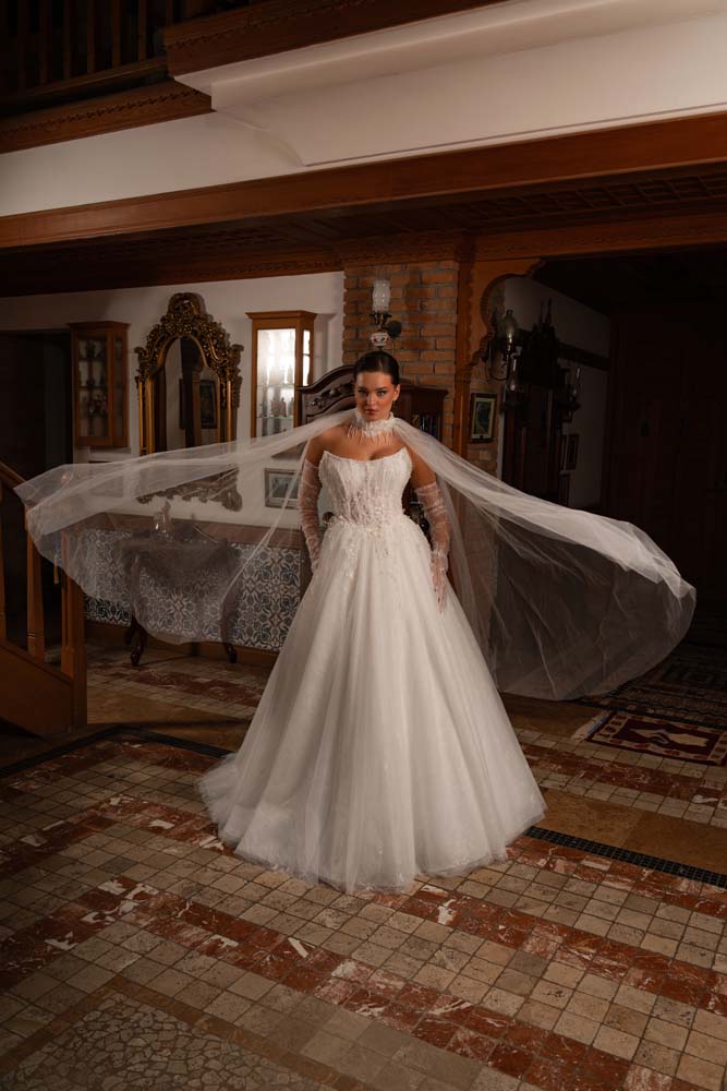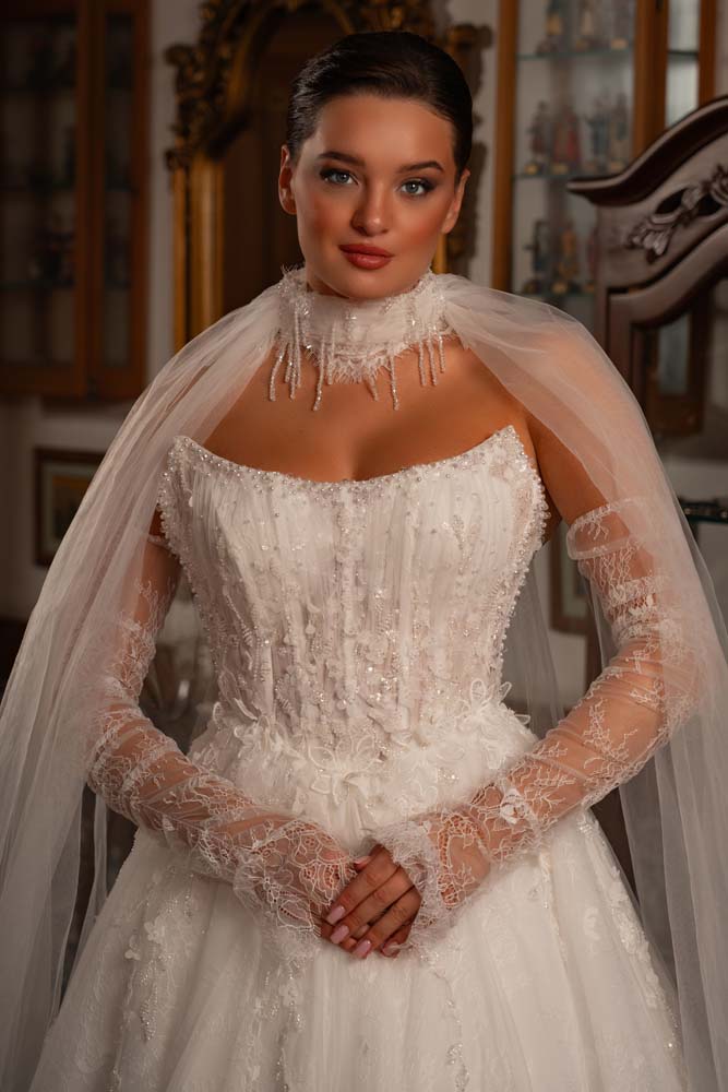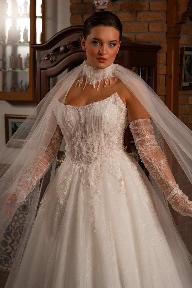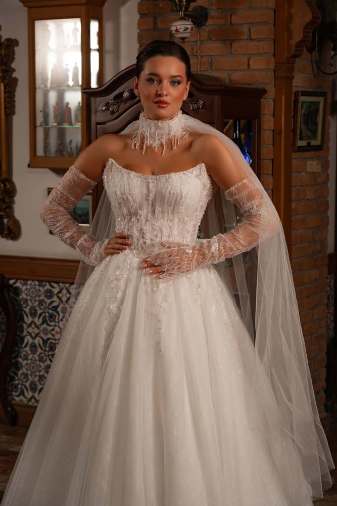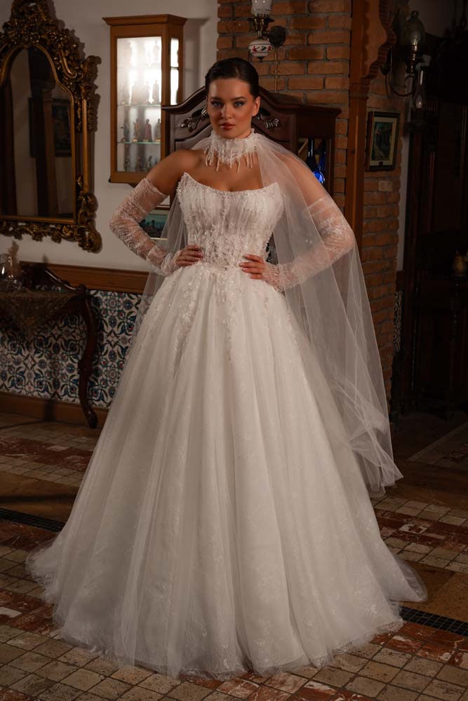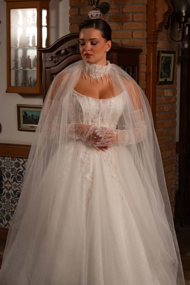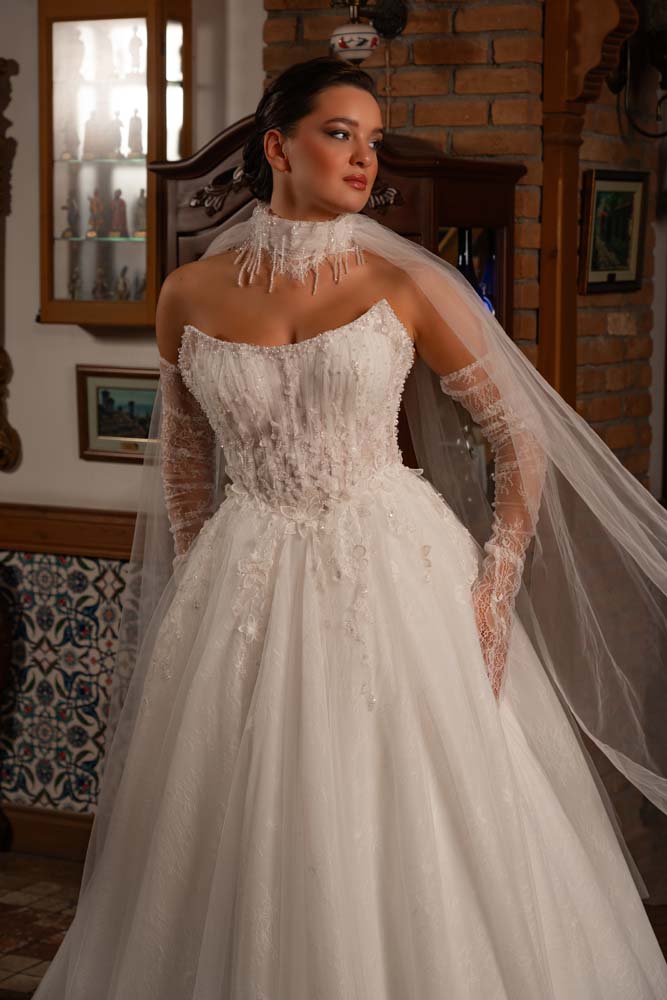 Havuz Yaka Fransız Korseli Tül Etek Detaylı Helen Model Gelinlik