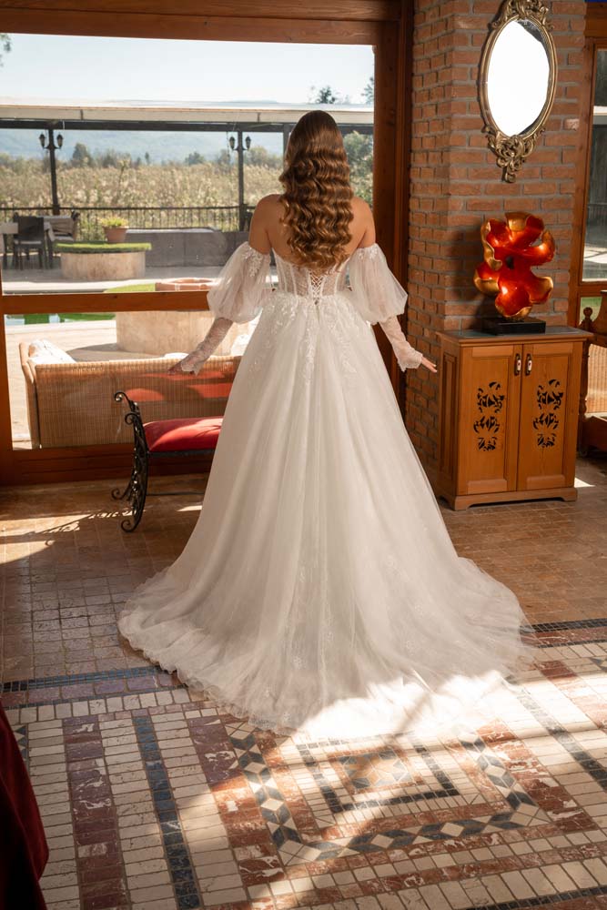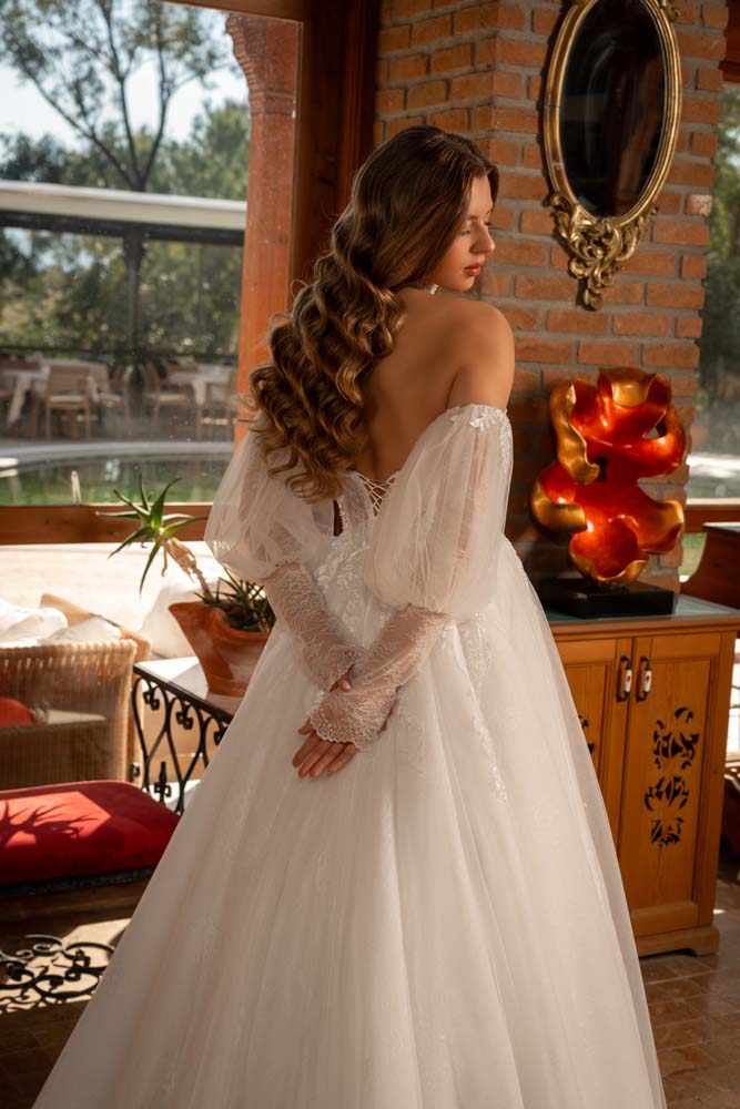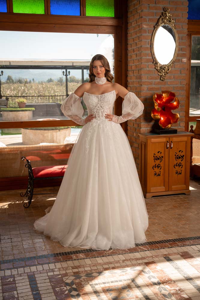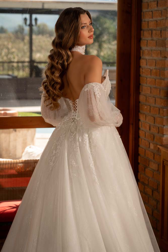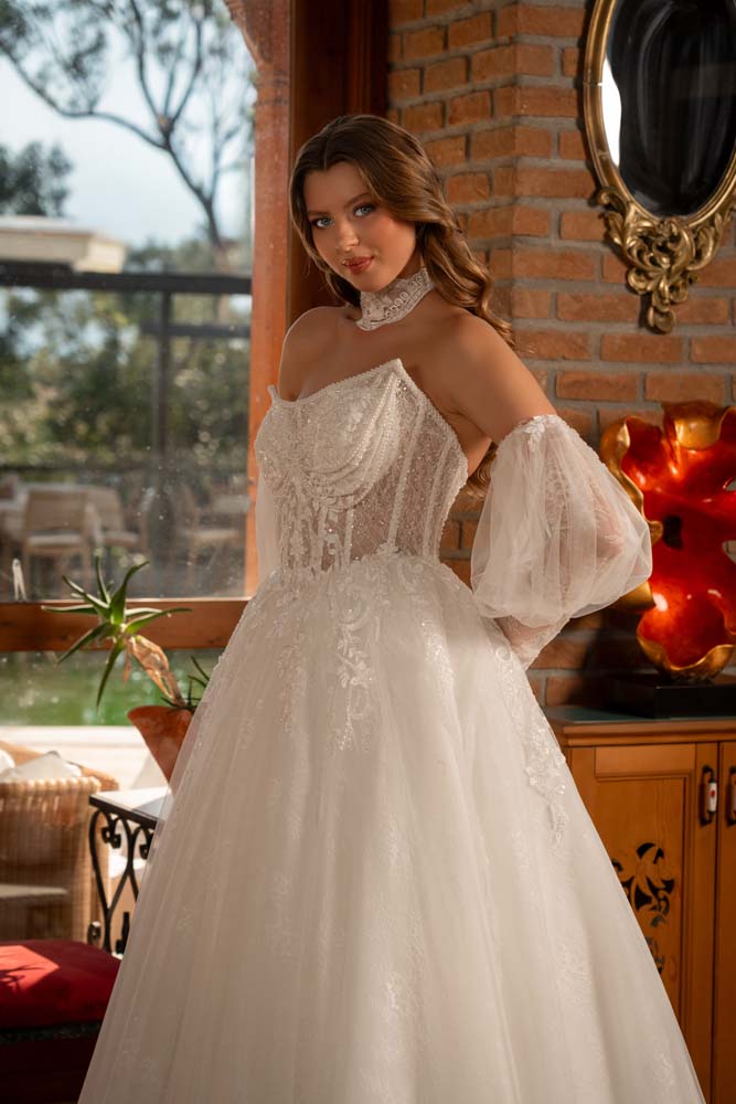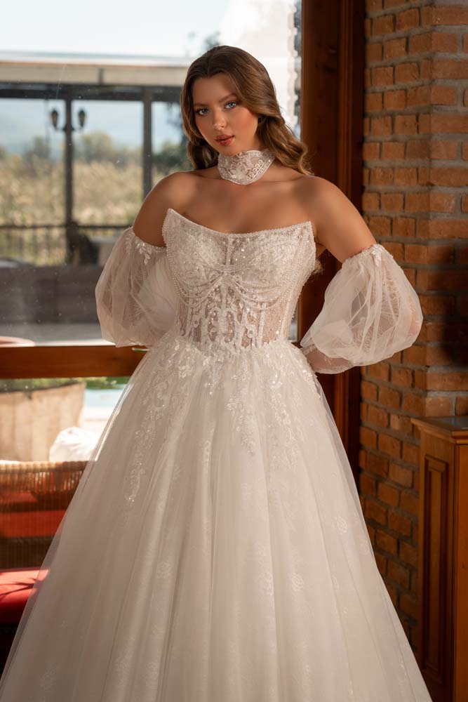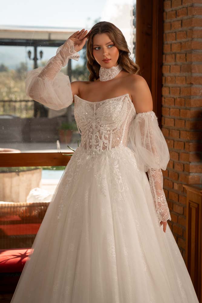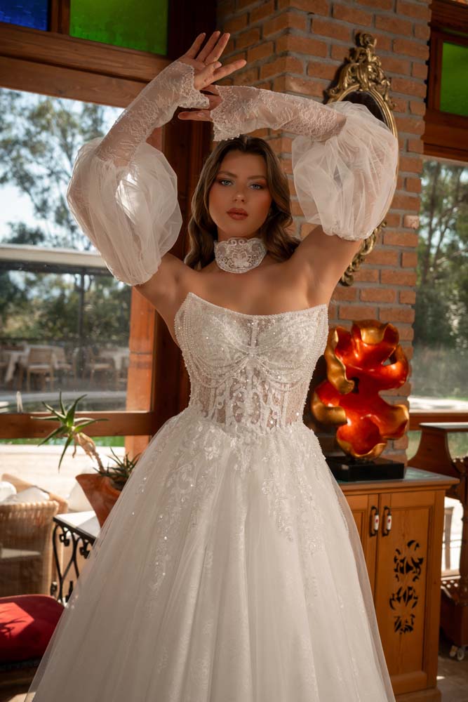 Havuz Yaka Transparan Beden Yan Kol Detaylı Helen Model Gelinlik