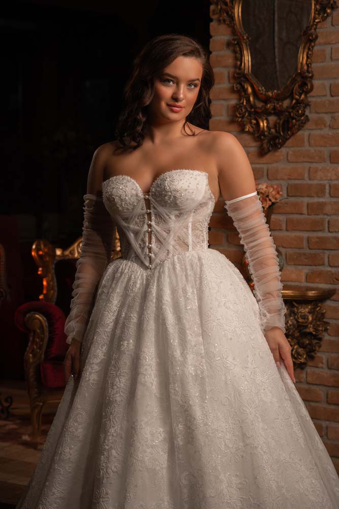 Göz alıcı kalp yaka (sweetheart) kesimiyle dekolte bölgesine romantik bir vurgu yapan bu model, gövde kısmındaki çapraz drape (büzgü) oyunlarıyla bel hattını kusursuzca ön plana çıkarır. Gelinliğin tamamına hakim olan dantel üzerine yoğun kristal işlemeler, her ışıkta büyüleyici bir parıltı sunar. Kabarık ve görkemli etek yapısı, prenses modelin asaletini yansıtırken, modele eşlik eden tül eldiven detayları modern bir vintage havası katar. Hem klasik hem de avangart bir görünüm isteyen gelinler için ideal bir başyapıt.