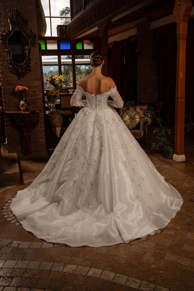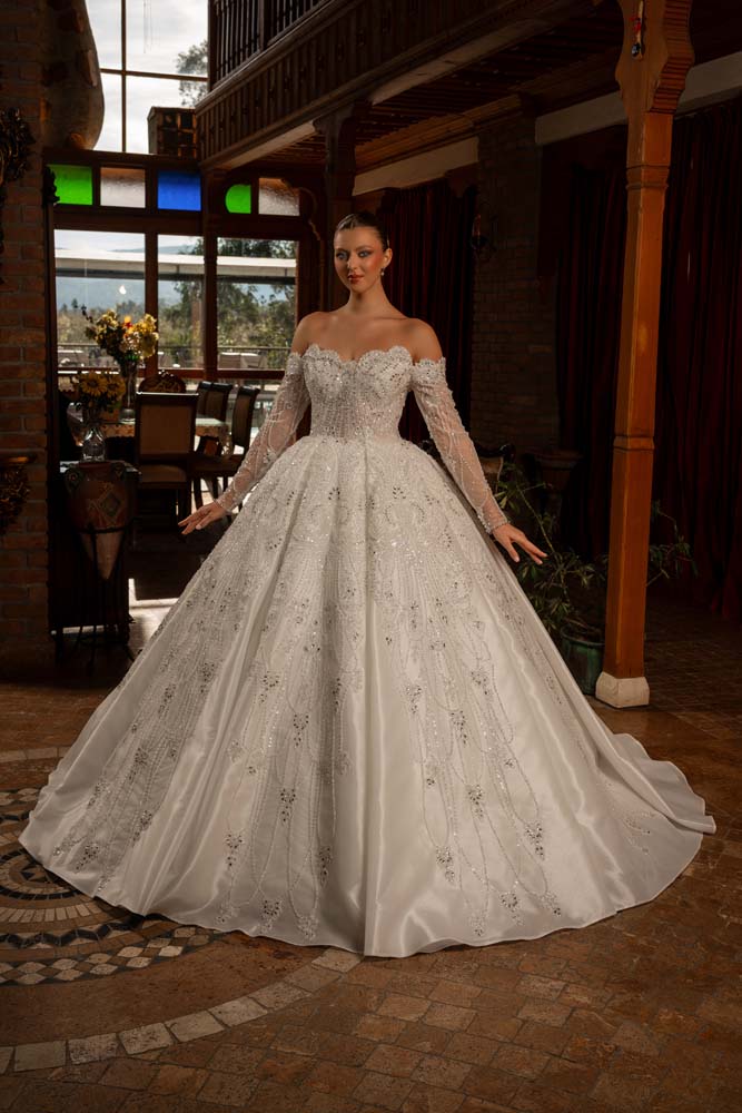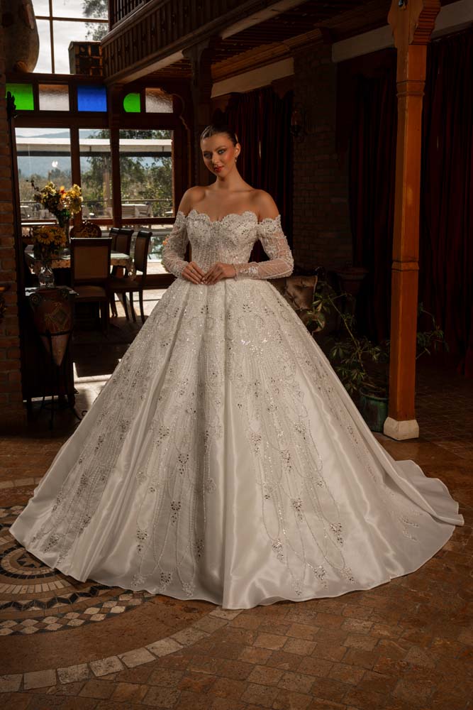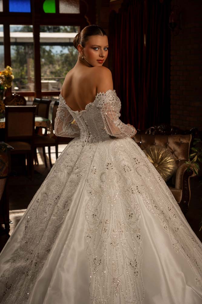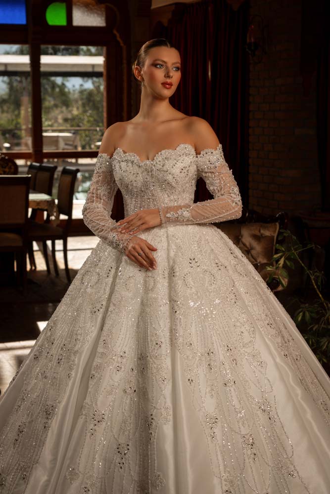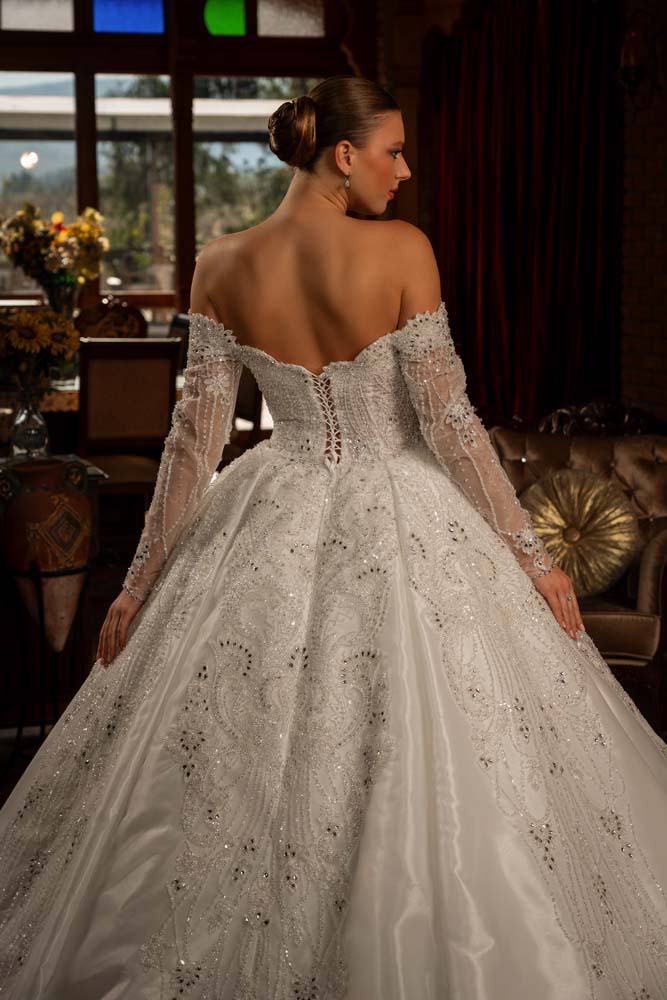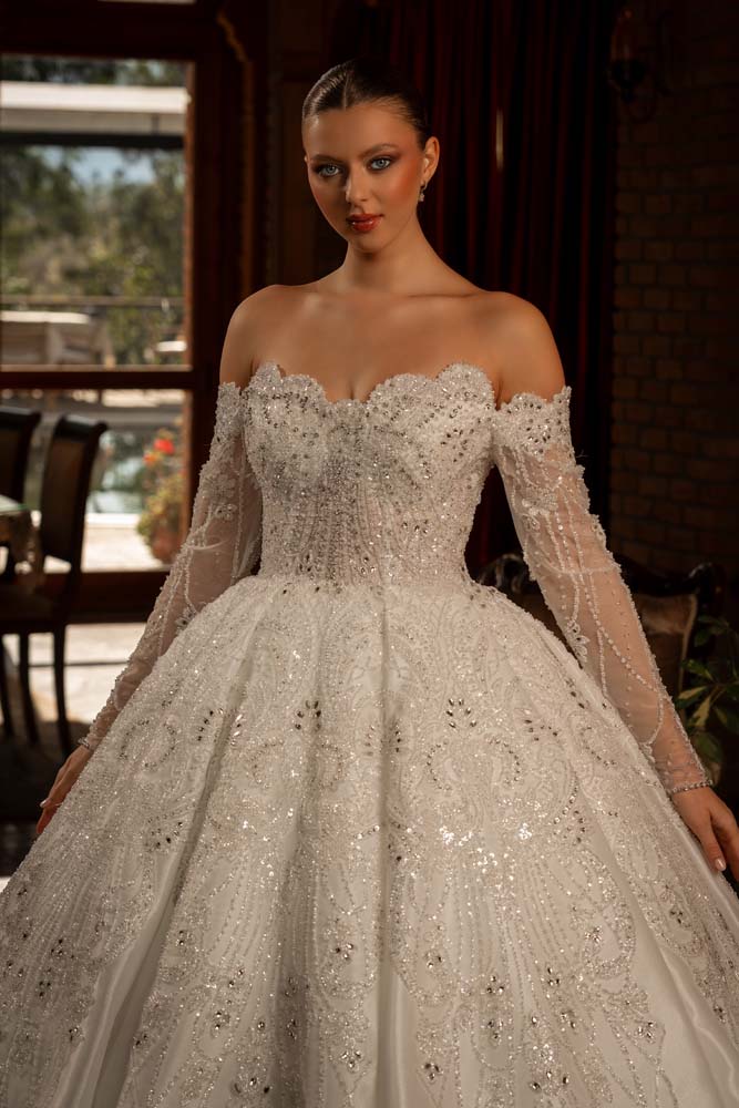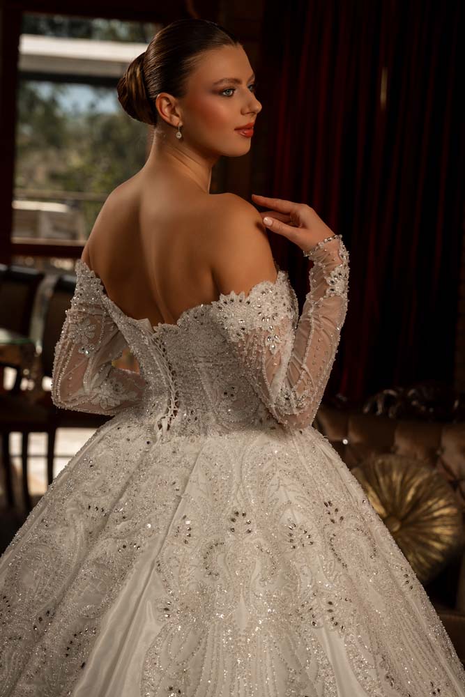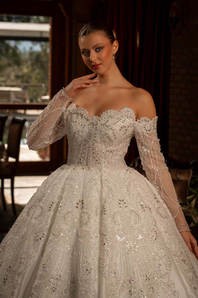 Kalp Yaka Komple İşlemeli Yan Kol Detaylı Prenses Model Gelinlik