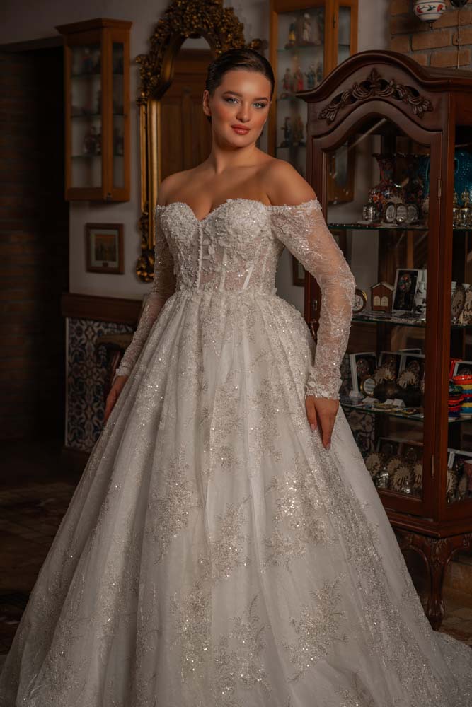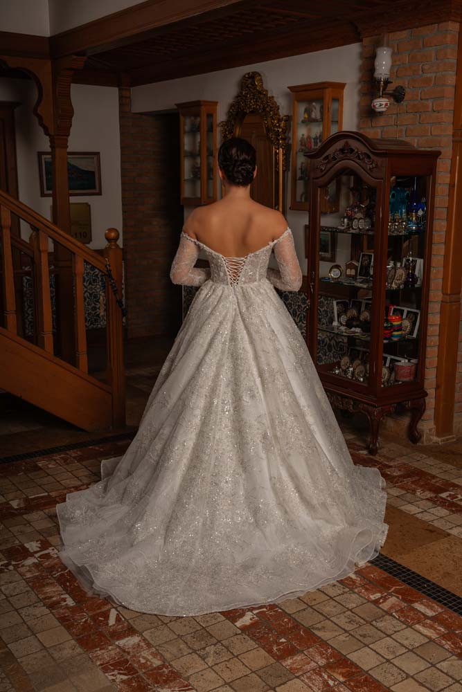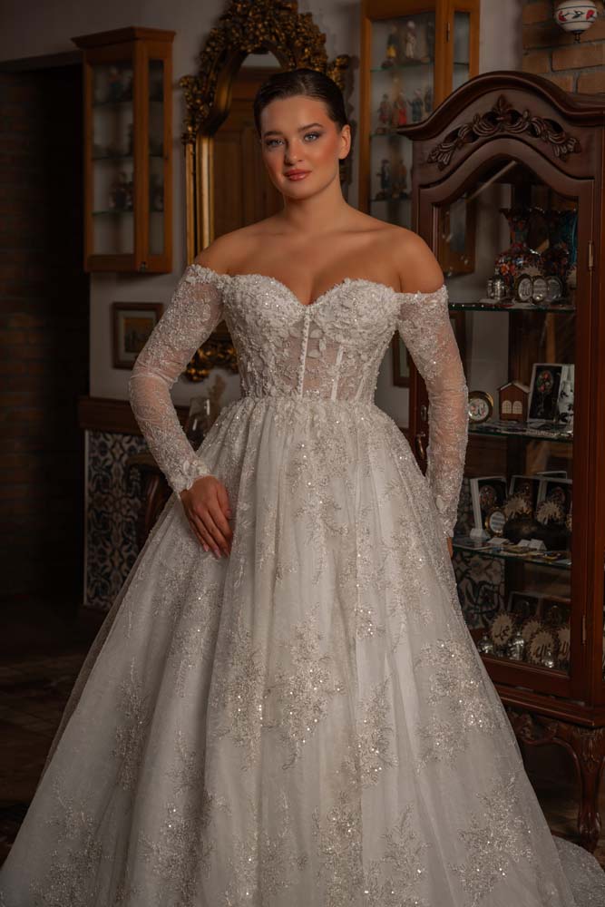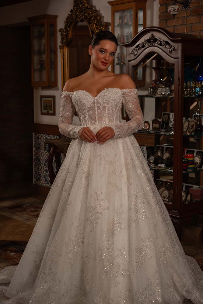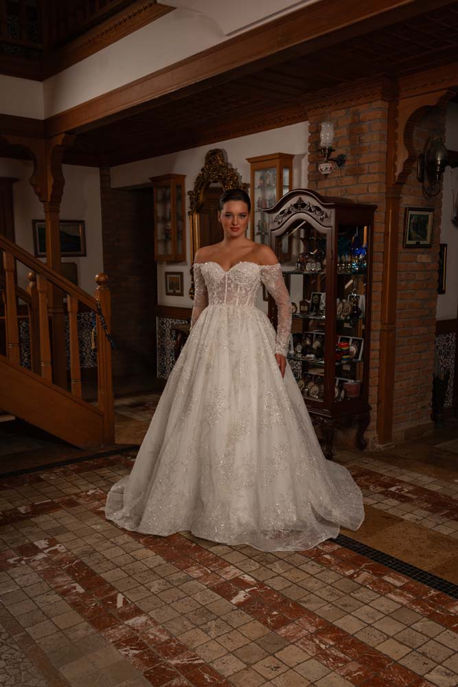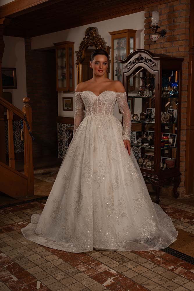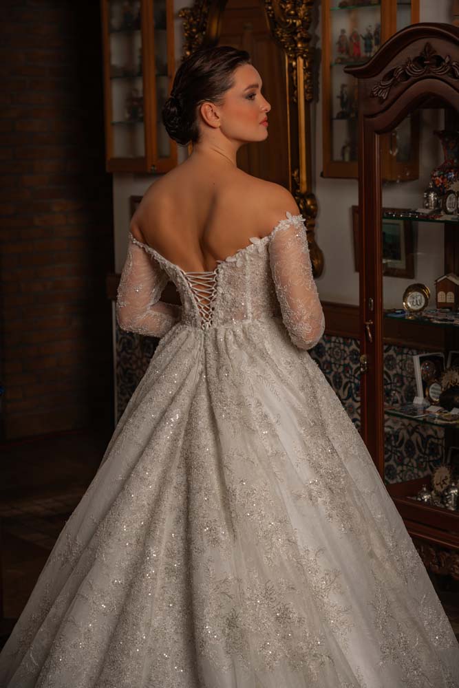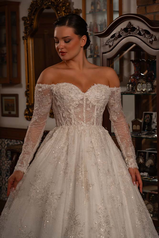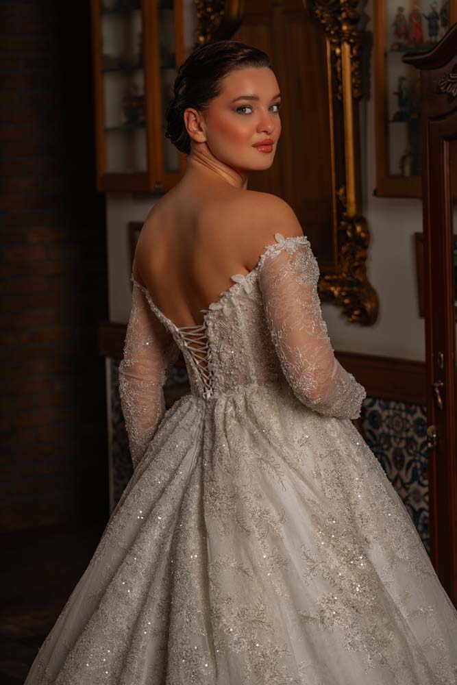 Düşlerdeki zarafeti gerçeğe dönüştüren bu model, kalp yaka (sweetheart) formuyla dekolteye romantik bir vurgu yaparken, transparan balenli korse yapısıyla modern bir couture estetiği sergiliyor. Gövdeden kollara ve eteğe süzülen ince el işçiliği dantel aplikeler, kristal parıltılarla zenginleştirilerek her adımda ışık saçmanızı sağlıyor. Omuzları açıkta bırakan düşük kol (off-shoulder) detayı, asil bir dekolte sunarken; vücudu yormayan hafif A kesim eteği, konforlu bir hareket özgürlüğü sunuyor. Hem tarihi mekanlara hem de açık hava düğünlerine eşsiz bir uyum sağlayan zamansız bir tasarım.