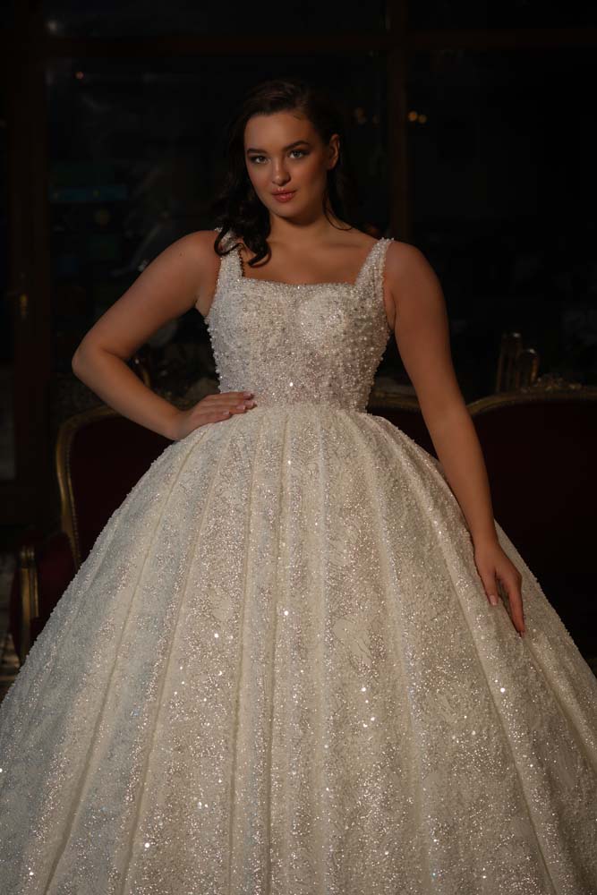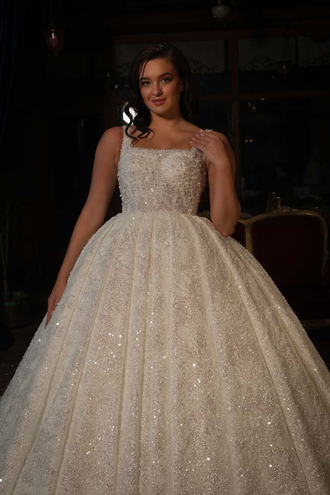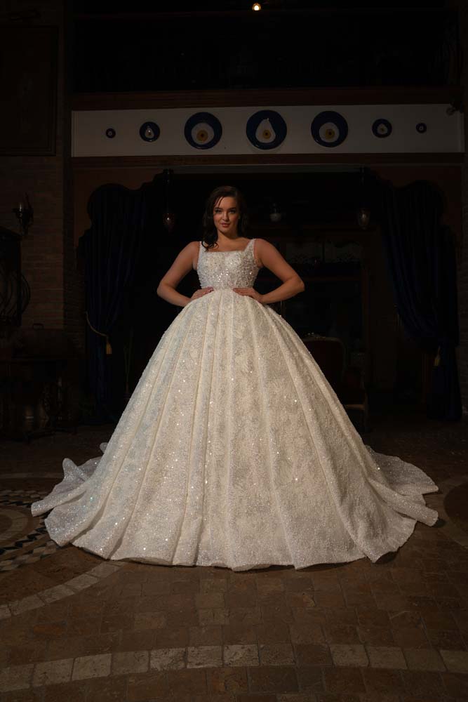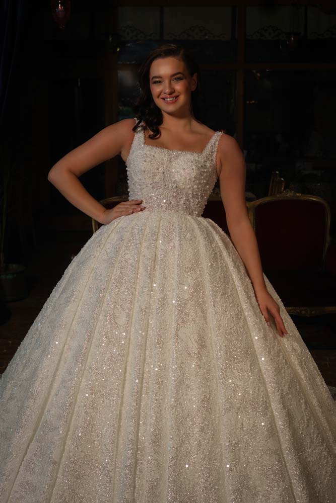 Göz alıcı bir silüet sunan bu prenses model, modern kare yaka formuyla omuz hattını zarifçe vurgularken, komple el işçiliği kristal işlemeleriyle her adımda ışık saçıyor. Belden başlayan derin pile detayları, etek kısmına dramatik bir hacim ve kraliyet ailesi esintili bir duruş kazandırıyor. Işıltılı dantel dokusu ve uzun kuyruğuyla birleşen bu tasarım, hem salon düğünleri hem de görkemli saray konseptleri için kusursuz bir tercih. Kendinizi bir masalın başrolünde hissetmeniz için tasarlandı.