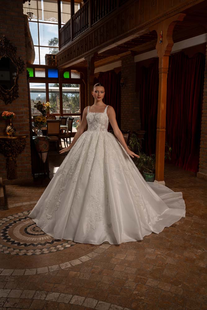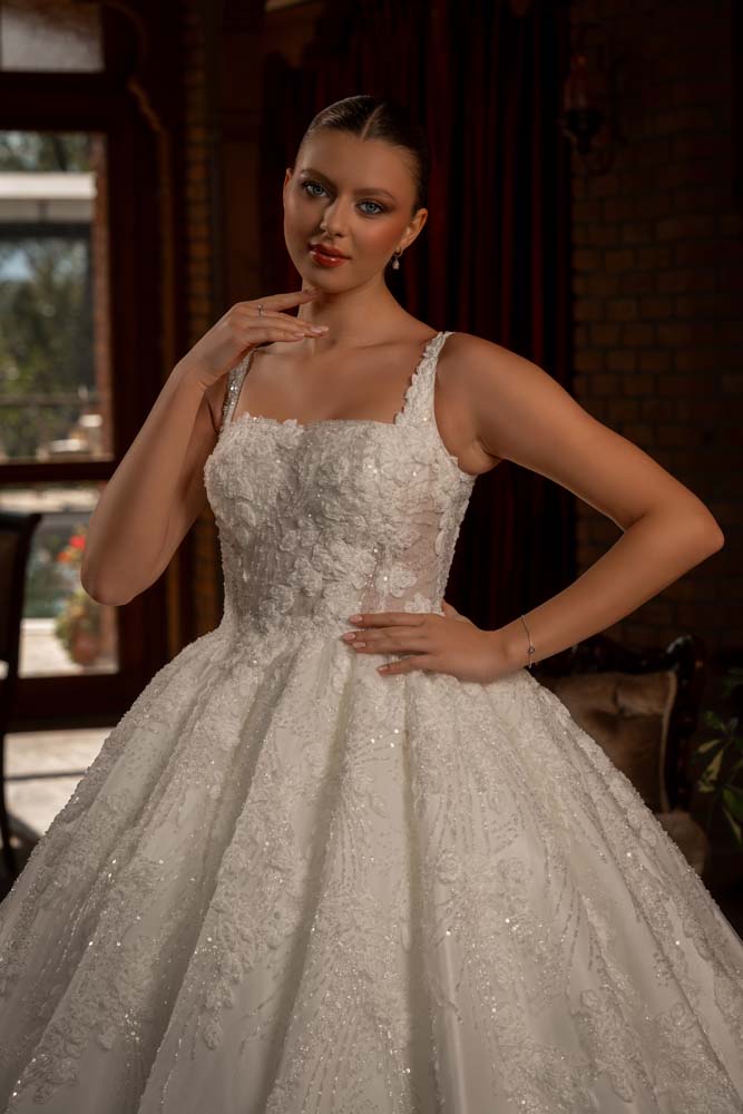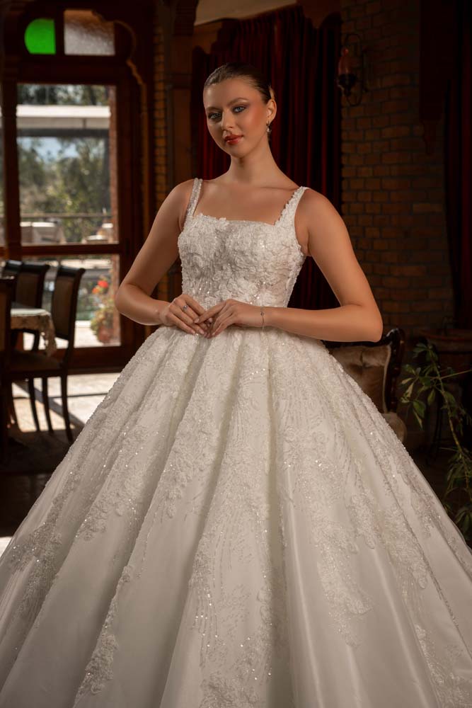 Kare Yaka Transparan Beden Pileli Prenses Model Gelinlik