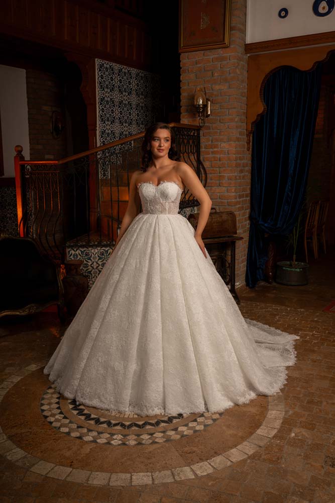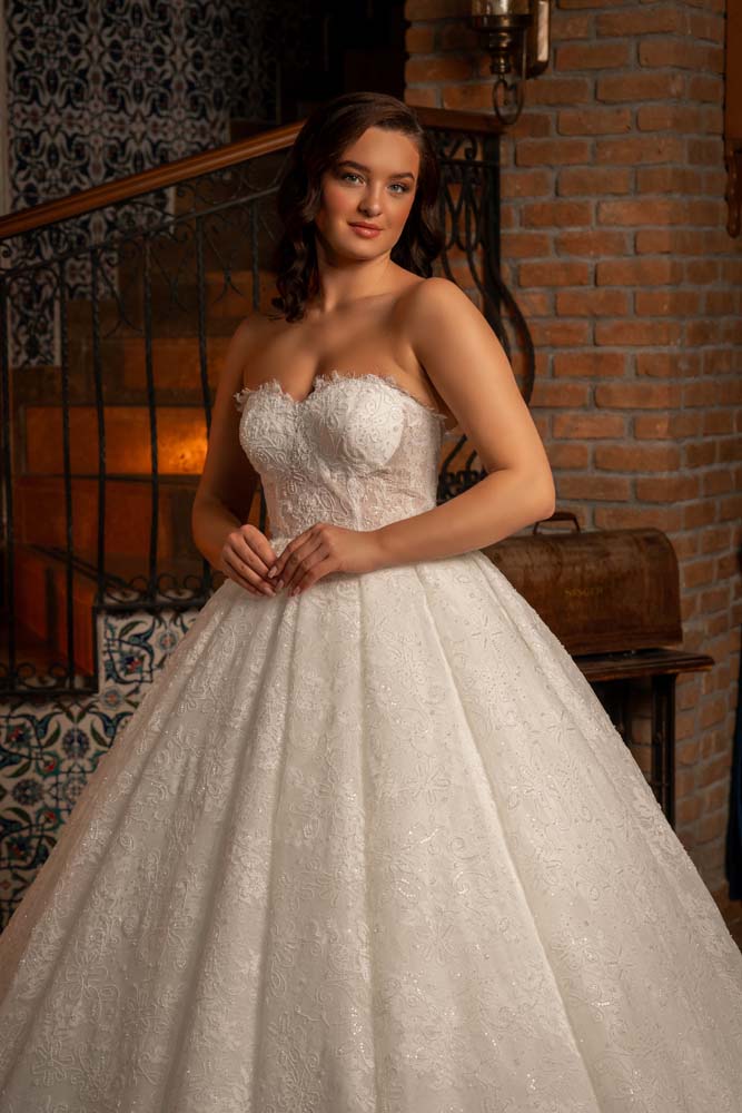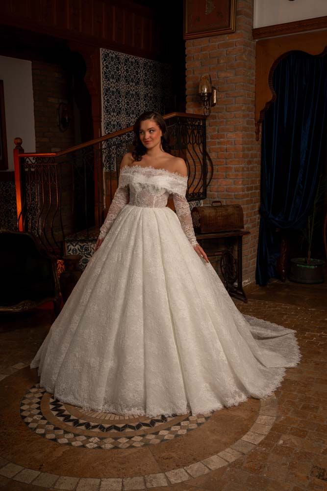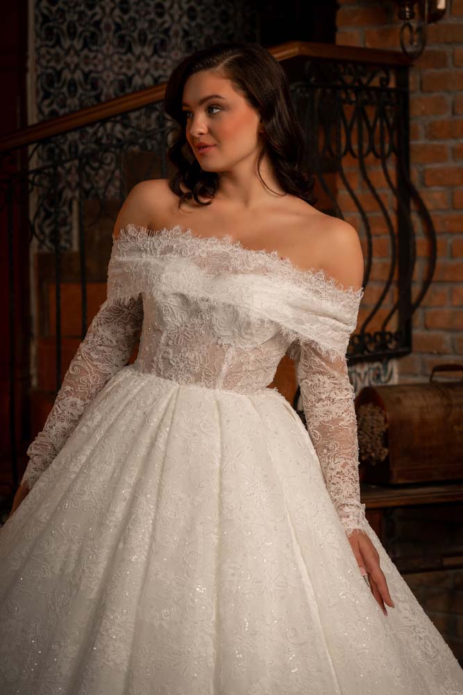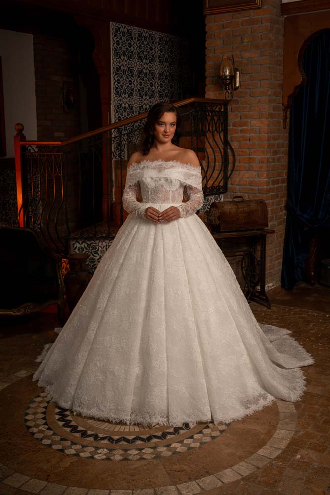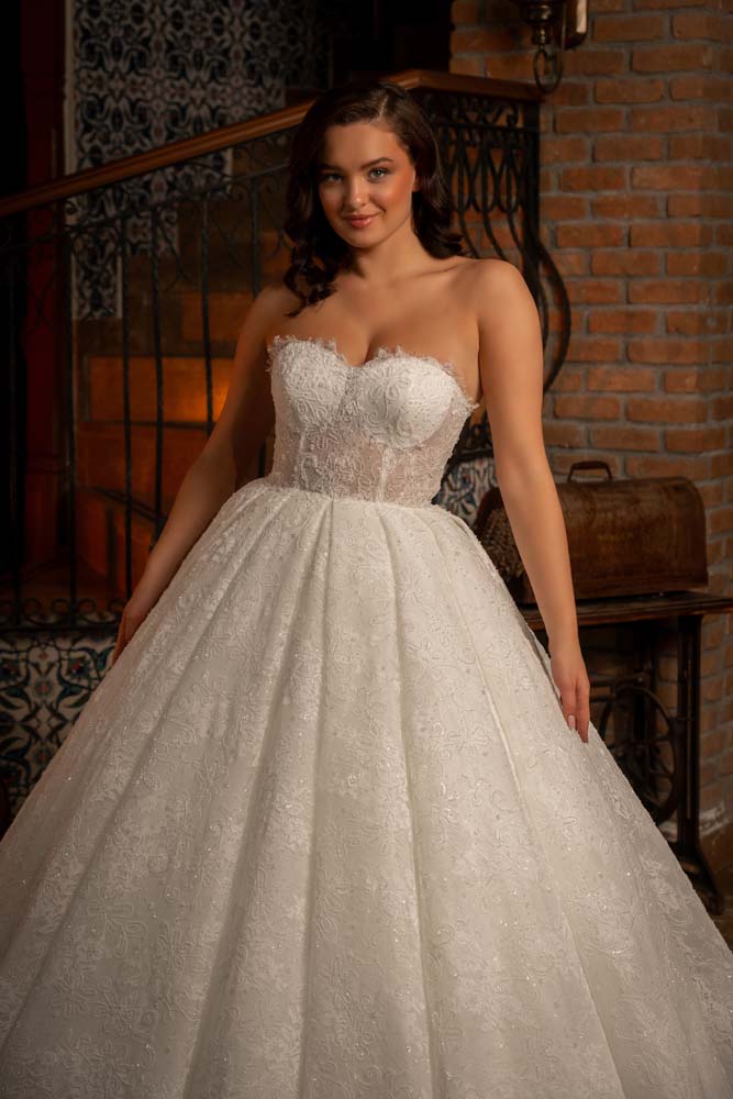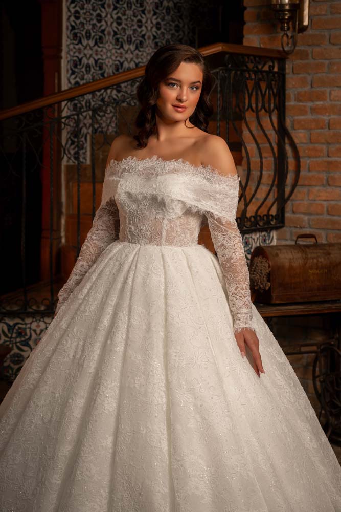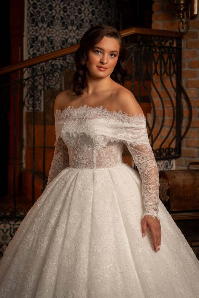 Kayık Yaka Komple Fransız Dantelli A Prenses Model Gelinlik