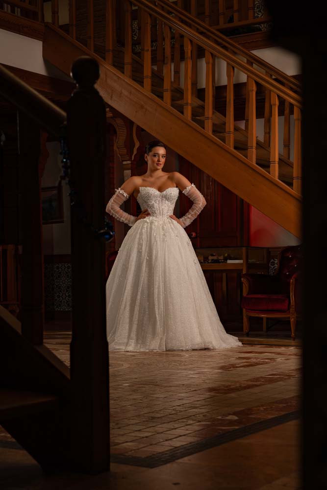 Dramatik bir silüet ve eşsiz bir zanaatkarlık arayan gelinler için tasarlanan bu model, kedi kulağı formundaki maskülen korse yaka kesimini transparan Fransız danteliyle harmanlıyor. Tasarımın imza detayı olan 'akıtma' işlemeler, belden başlayarak eteğin hacimli kıvrımlarına doğru bir su yolu gibi süzülerek göz alıcı bir derinlik yaratıyor. Omuzlardan bağımsız, büzgülü ve 3D çiçek detaylı yan kol (eldiven) eklentileri, tasarıma modern bir vintage havası katıyor. Her ışıkta farklı bir parıltı saçan bu tasarım, görkemli salon düğünlerinde sizi bir masal kahramanına dönüştürecek.