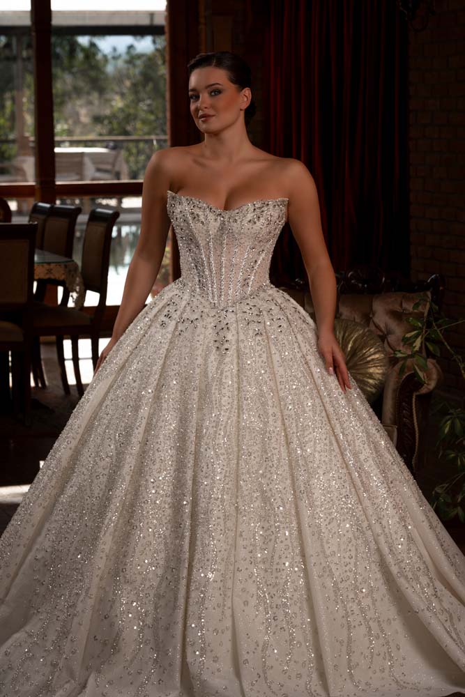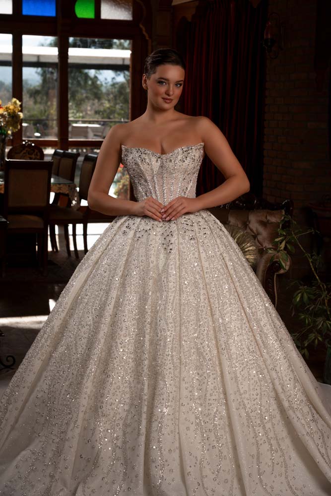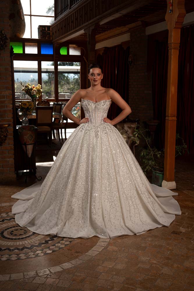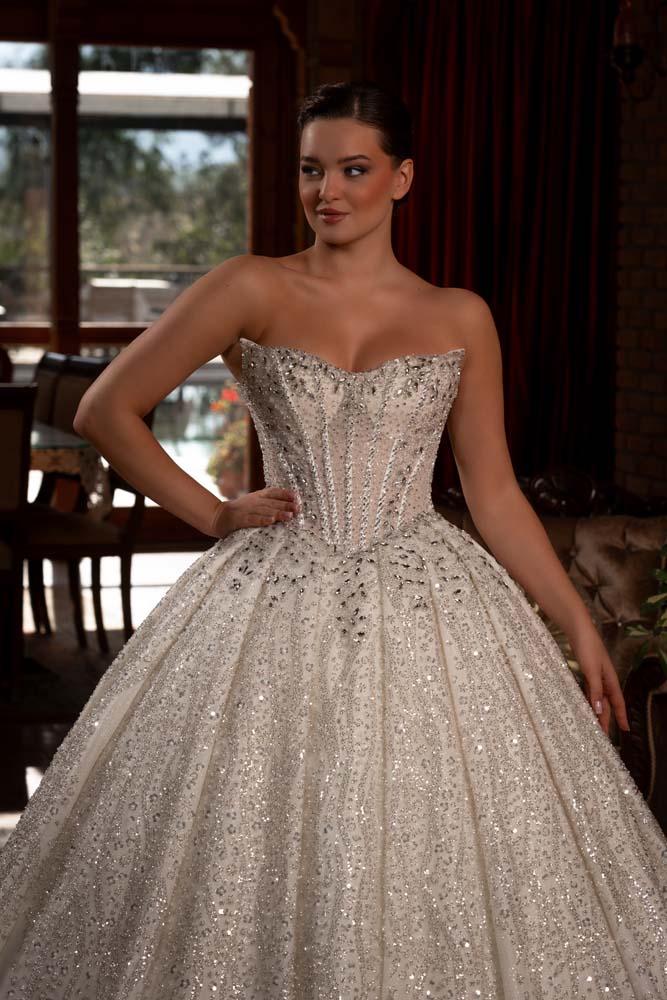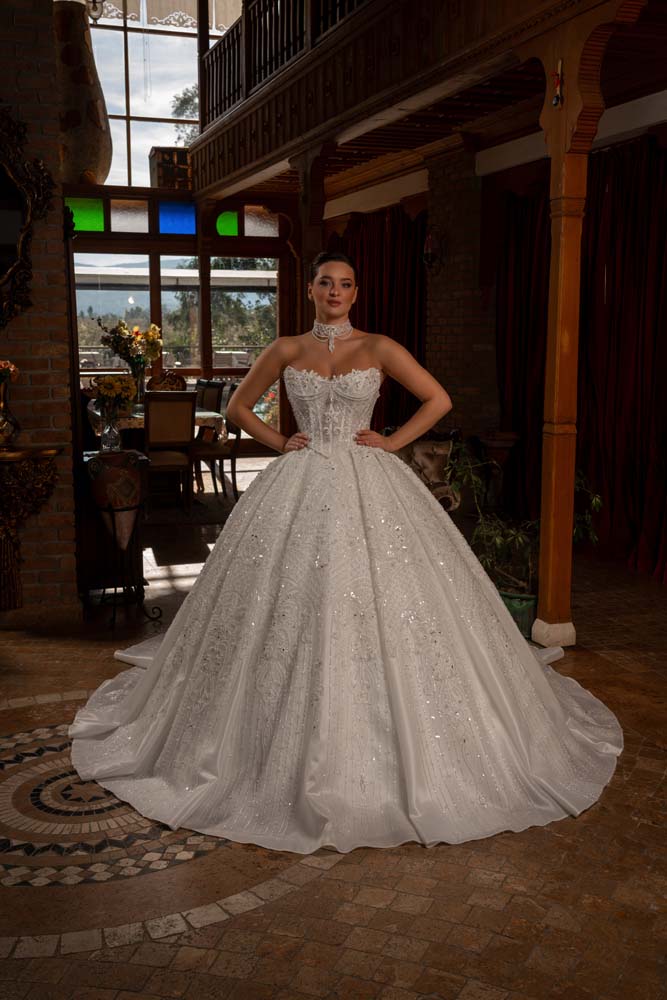 Tasarımın odak noktası olan 'kedi kulağı' formundaki korse yaka kesimi, dekolteye modern ve iddialı bir geometrik dokunuş katıyor. Gövdenin tamamına hakim olan ve eteğin derin pilelerine kadar süzülen yoğun kasnak işlemeleri, kristal ve inci ışıltısını her santimetresine taşıyor. Belden başlayan geniş pileler, eteğe görkemli bir hacim kazandırırken; ışıltılı choker kolye detayıyla tamamlanan bu model, saray düğünlerinden lüks otel konseptlerine kadar her mekanda büyüleyici bir aura yaratıyor
