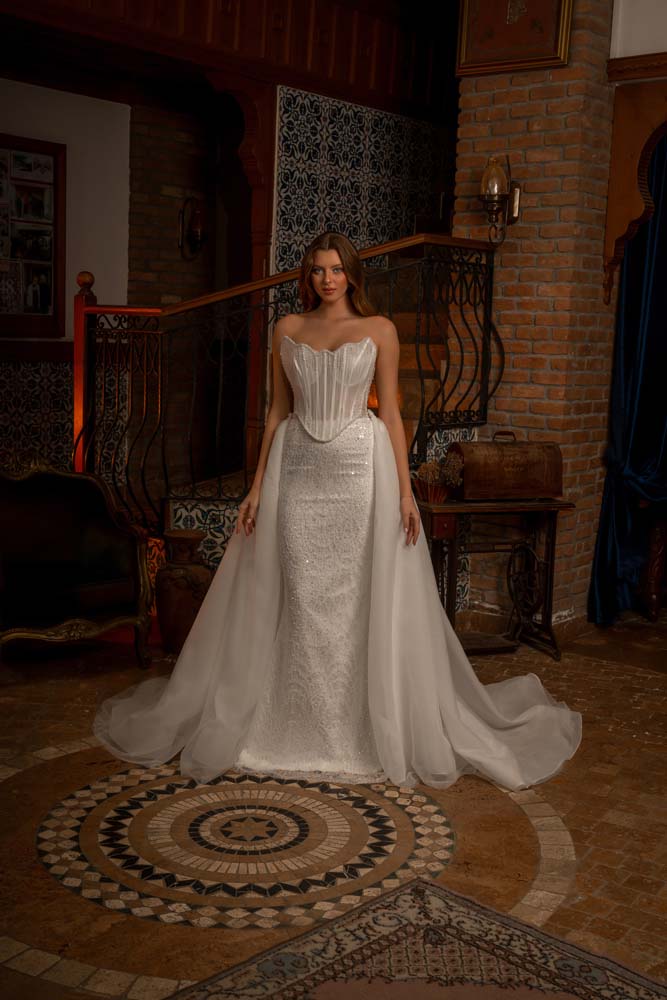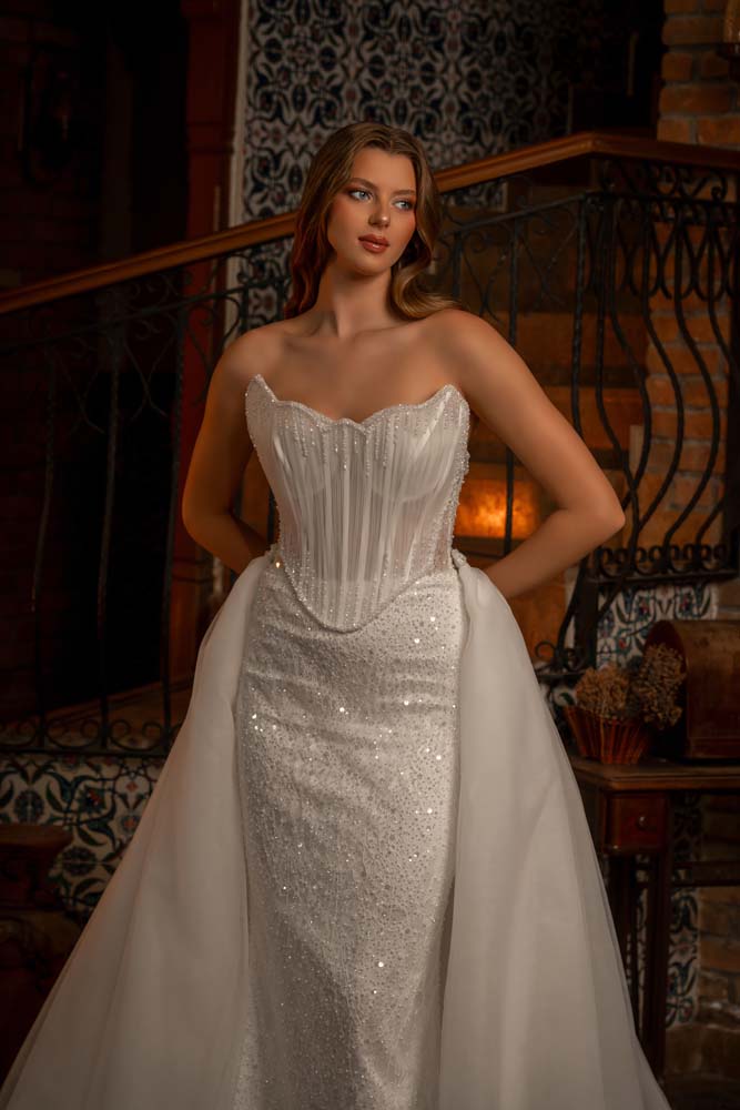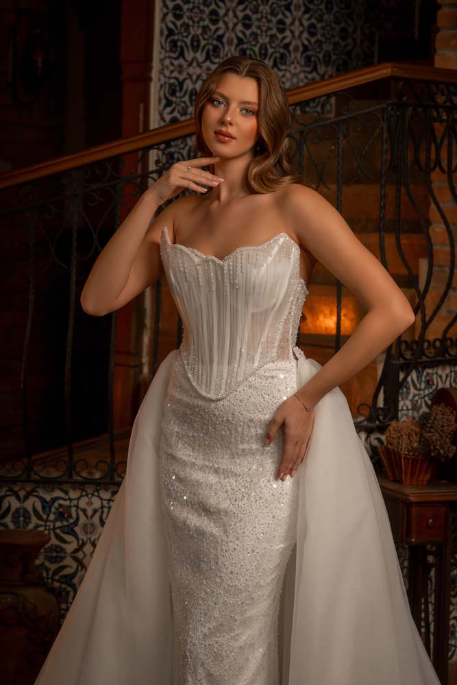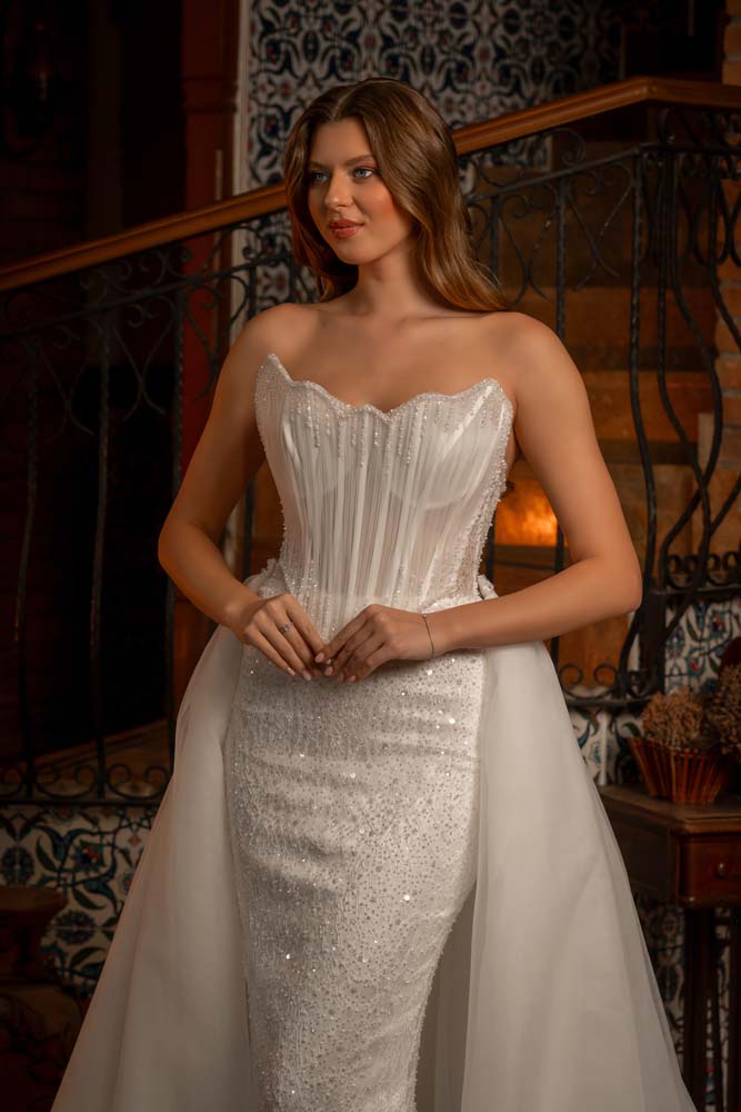 Kedi Kulağı Yaka Fransız Korse Detay Tül Demonte Kuyruk Balık Model Gelinlik