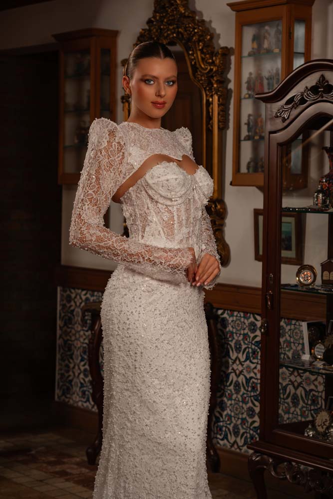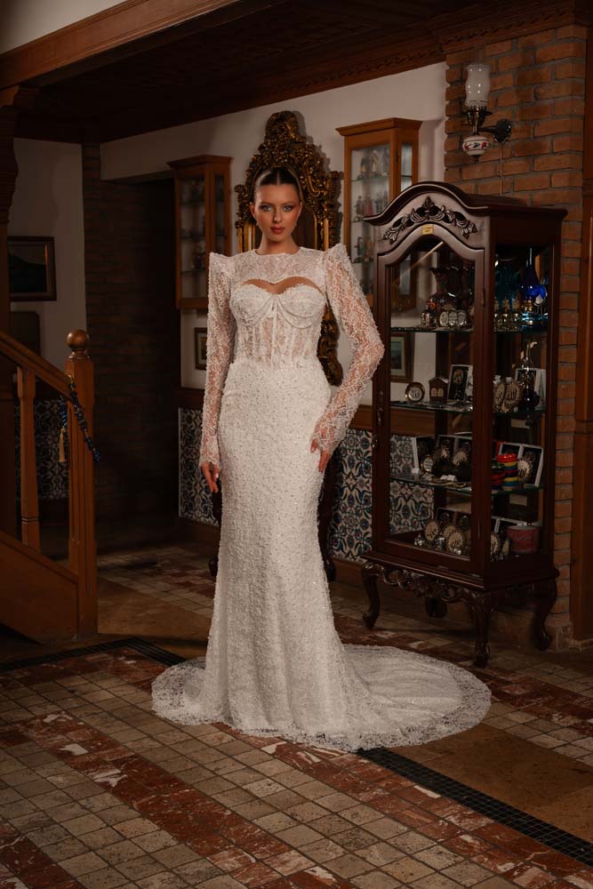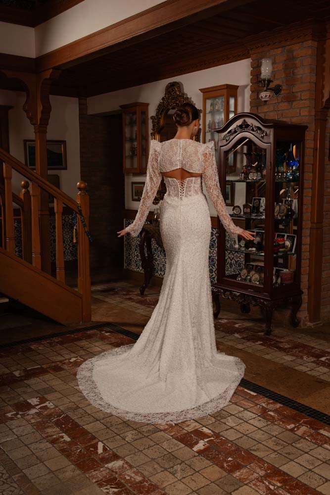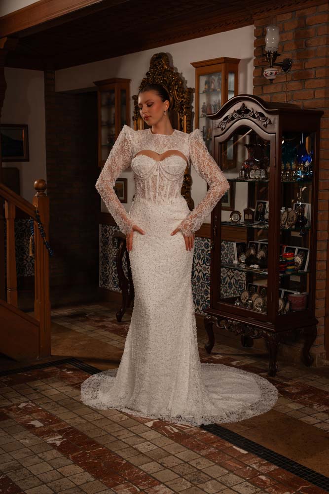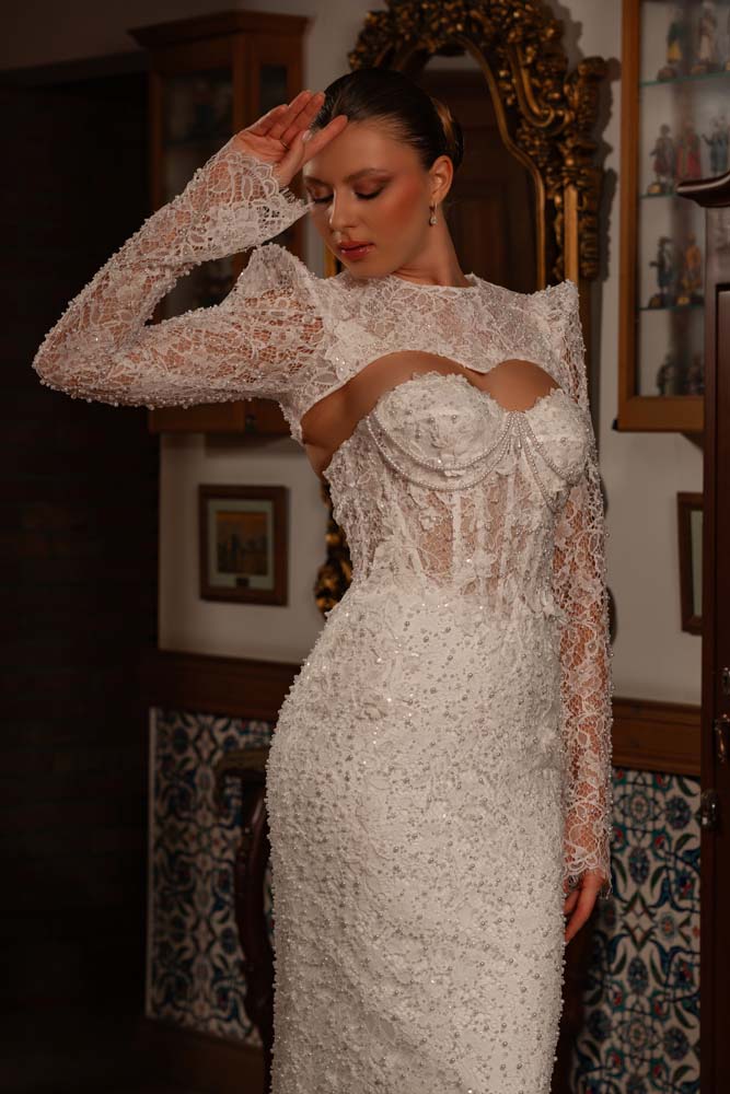 M Yaka Demonte Omuz ve Kol Detaylı Komple Fransız Dantelli Balık Model Gelinlik