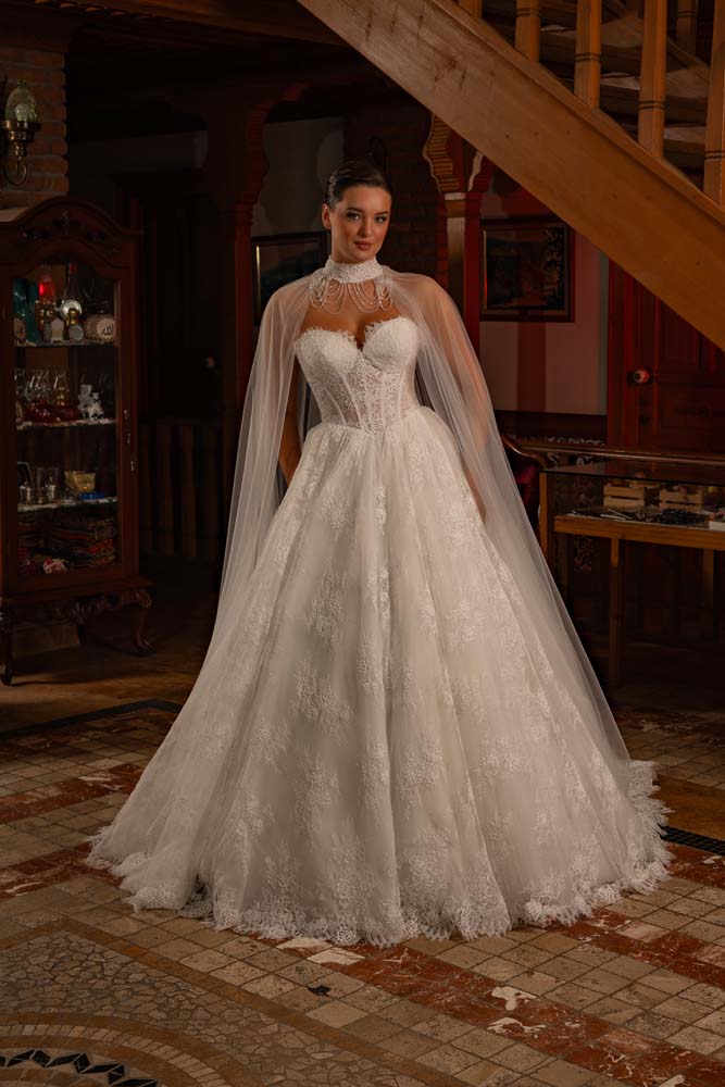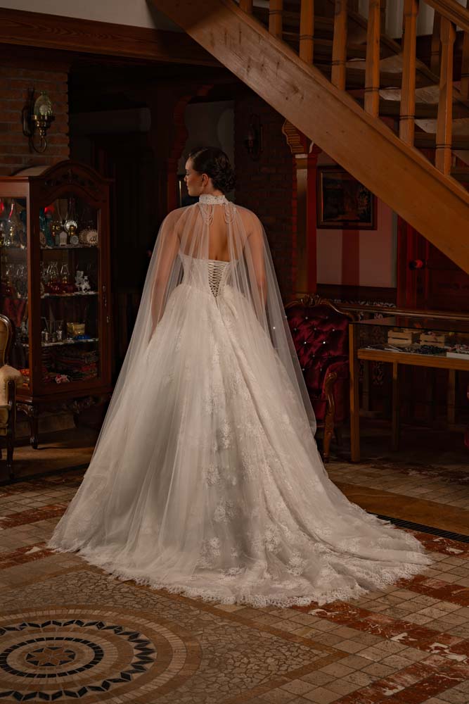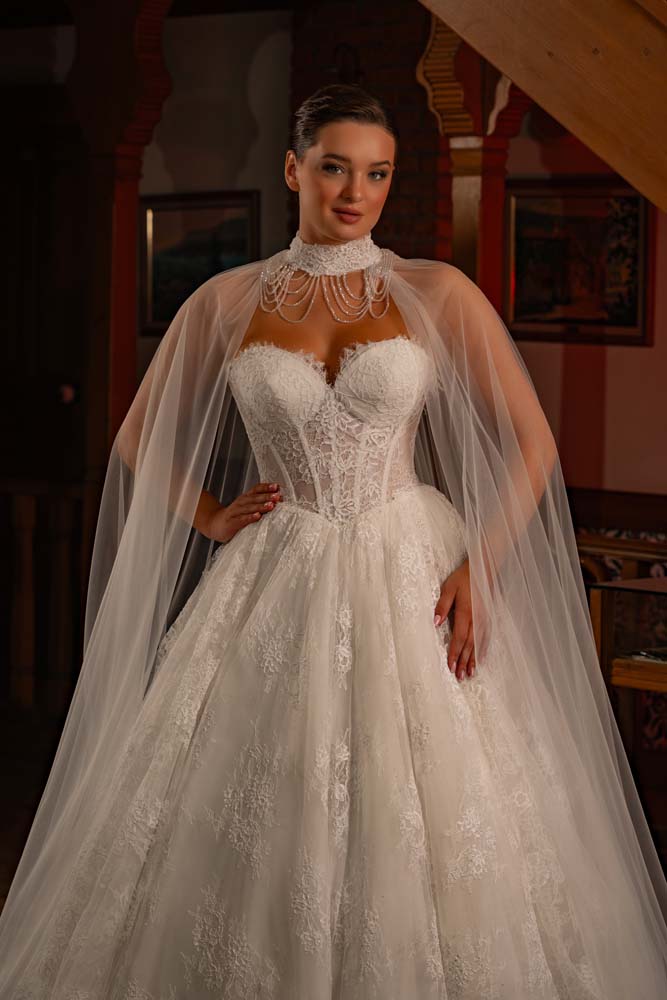M Yaka Fransız Korse Boyundan Pelerin Detaylı Helen Model Gelinlik