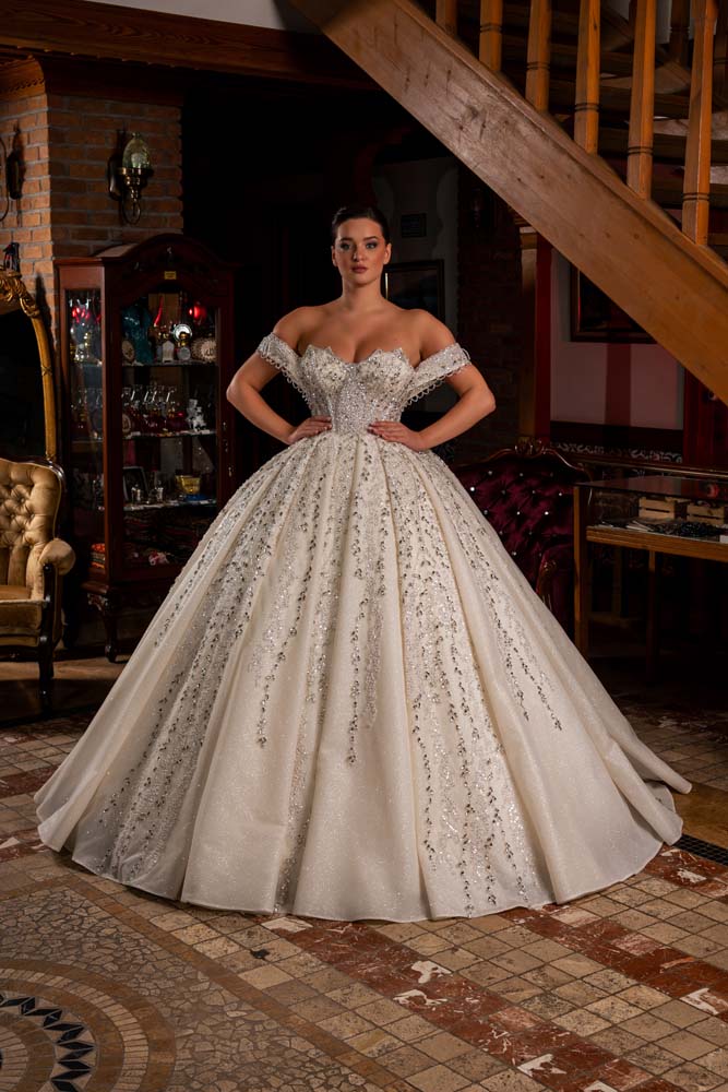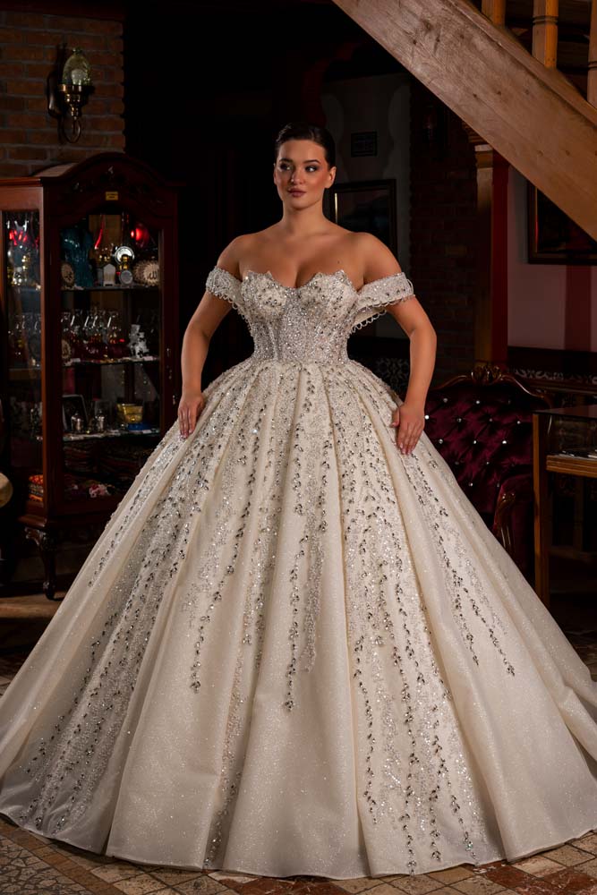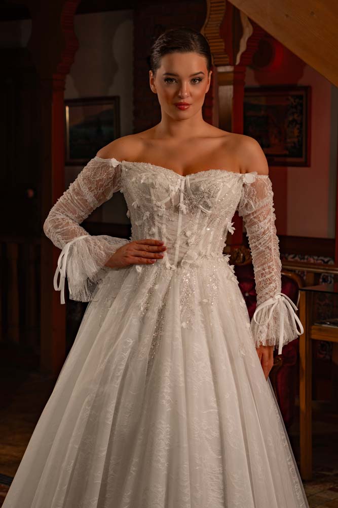 M Yaka Yan Kol Detaylı Üç Boyut Dantelli Helen Model Gelinlik