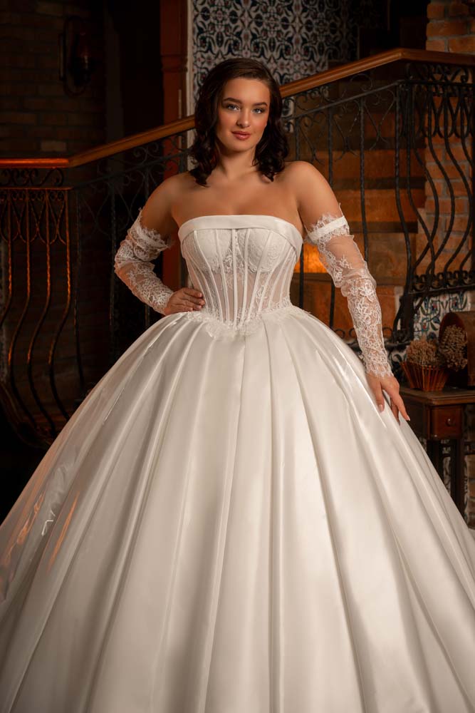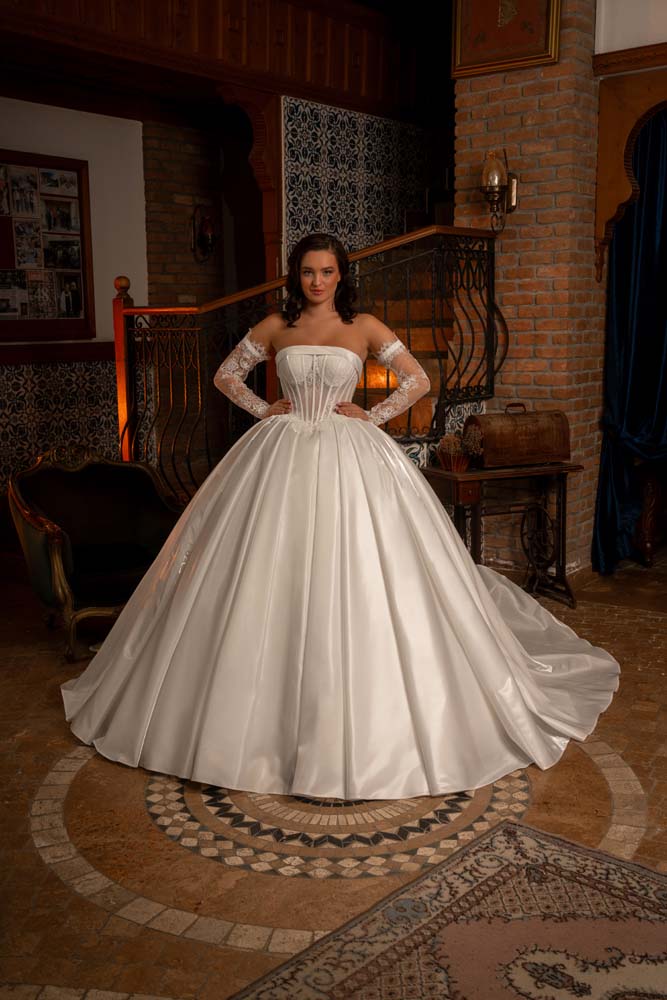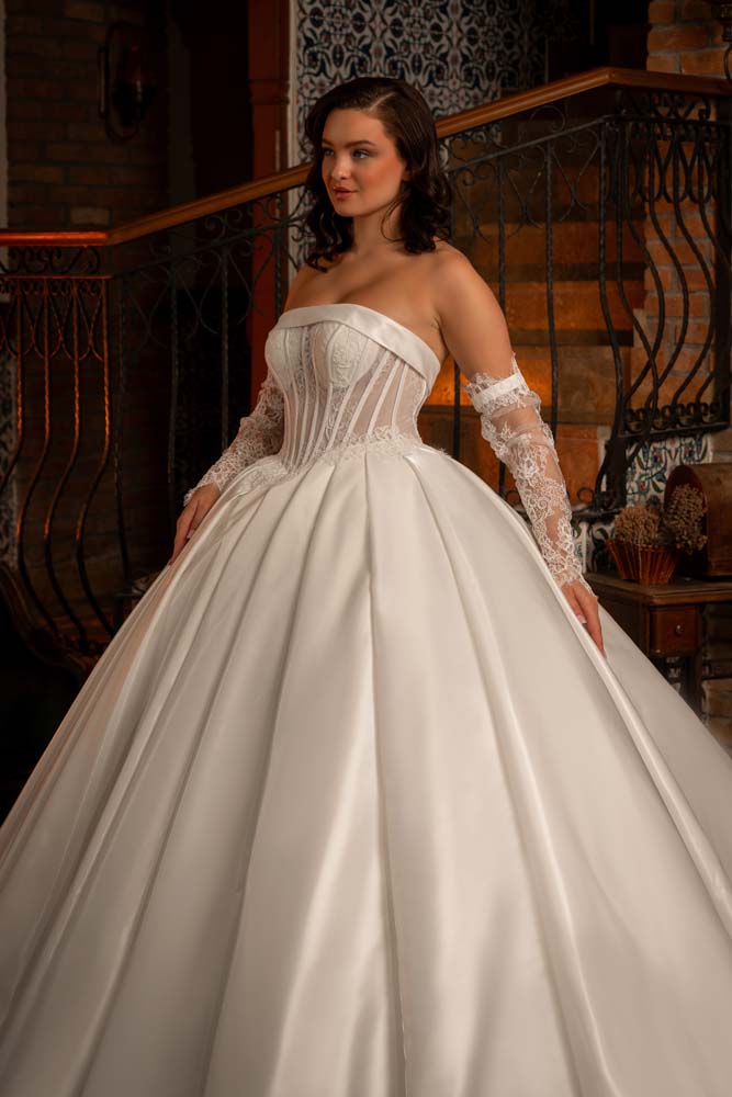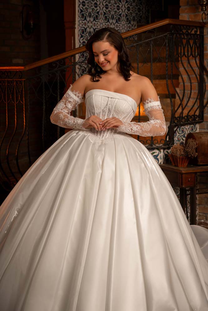 Saten pileli Fransız Yaka Kol Detaylı Prenses Model Gelinlik