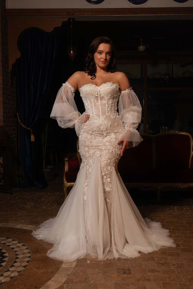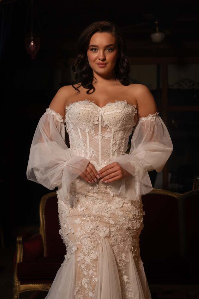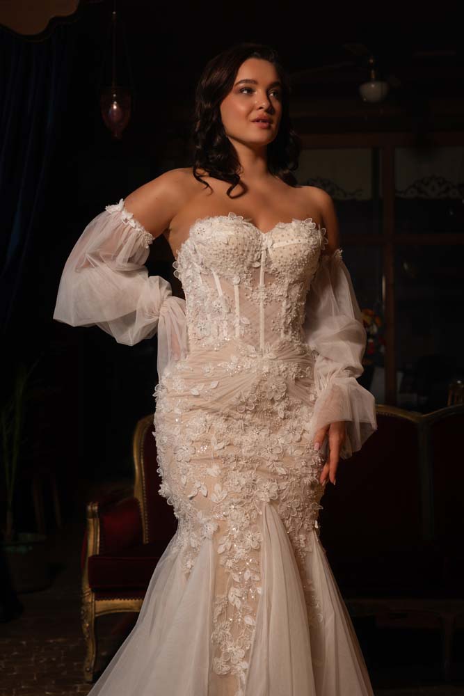 Göz alıcı bir silüet için tasarlanan bu model, transparan balenli korse bedeniyle modern bir dokunuş sunarken, üzerindeki yoğun üç boyutlu çiçek aplikeleriyle romantik bir derinlik kazanıyor. Etek kısmındaki özel 'kamalı' tül detayları, balık modelin feminen hatlarını Helenistik bir uçuşkanlıkla birleştiriyor. Portatif balon kollar, gelinliğe bohem bir hava katarken aynı zamanda iki farklı görünüm imkanı sağlıyor. Hem iddialı hem de masalsı bir duruş sergilemek isteyen gelinler için eşsiz bir parça.