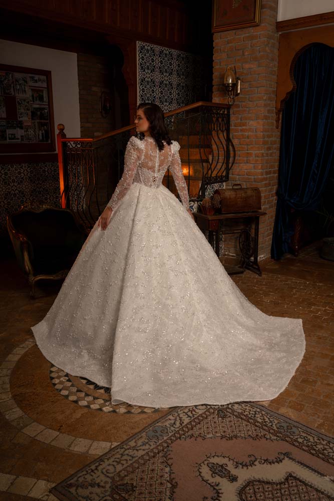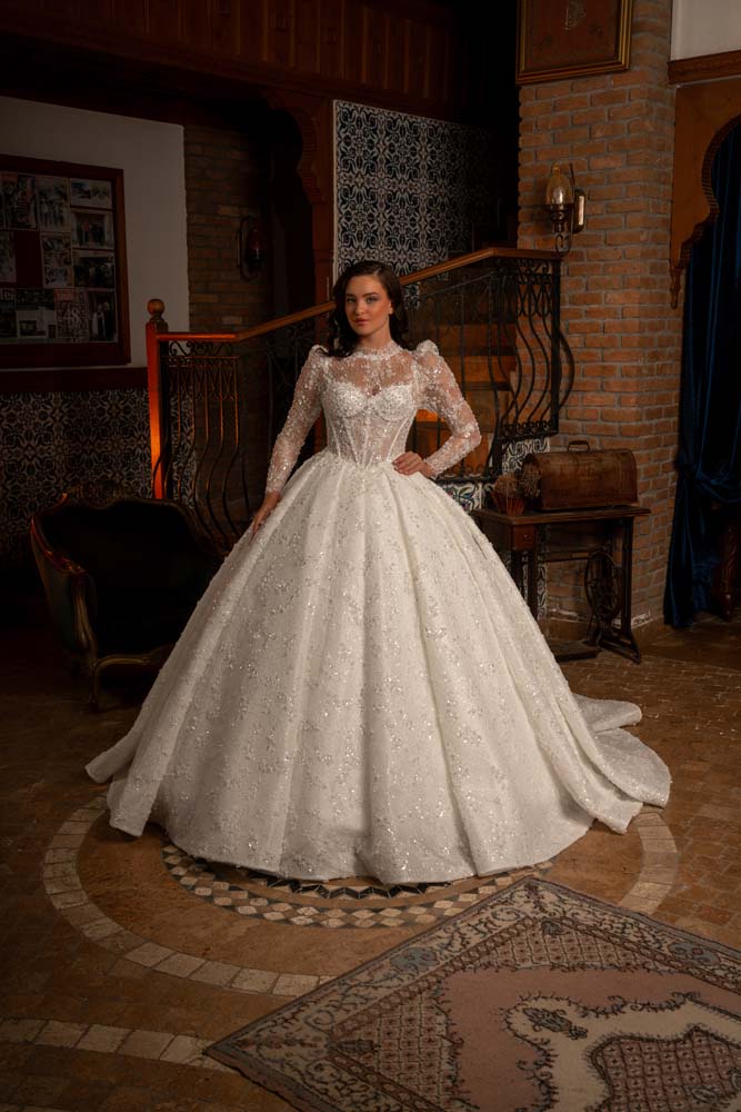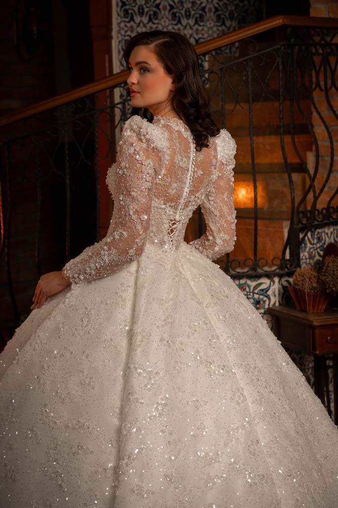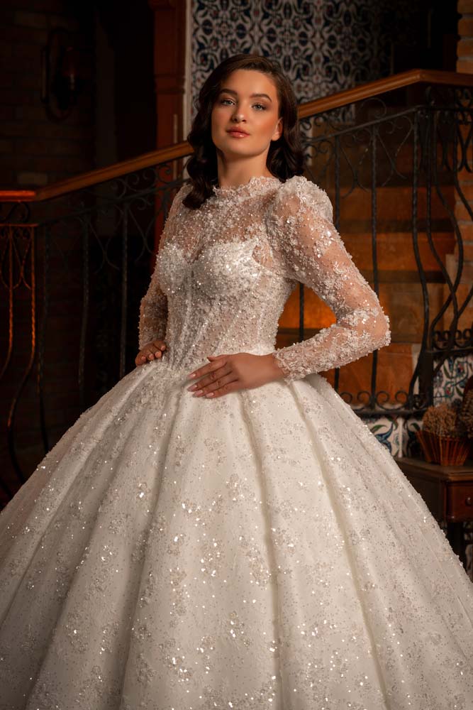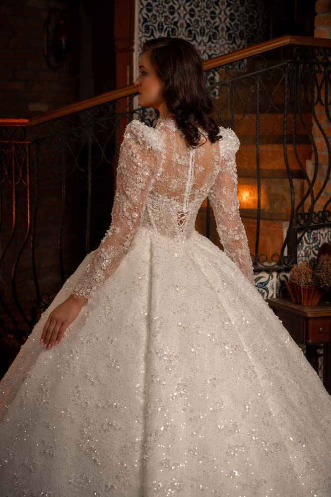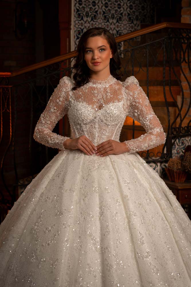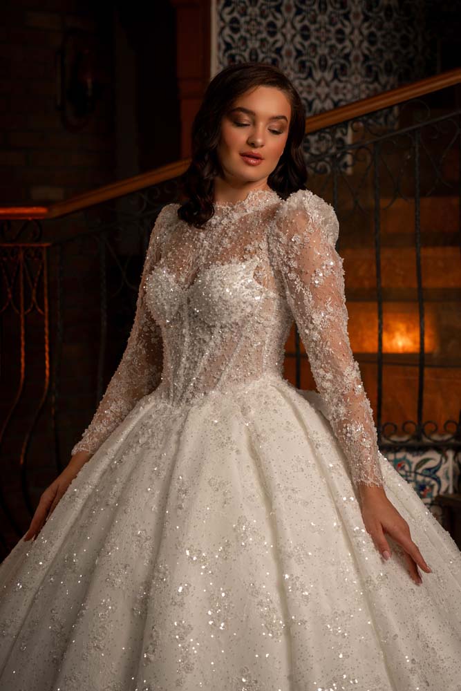 Transparan Beden Yaka Kol Komple İşlemeli Prenses Model Gelinlik